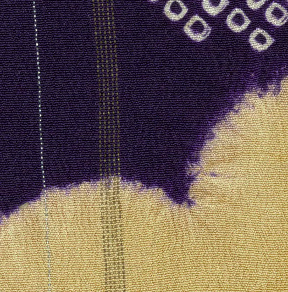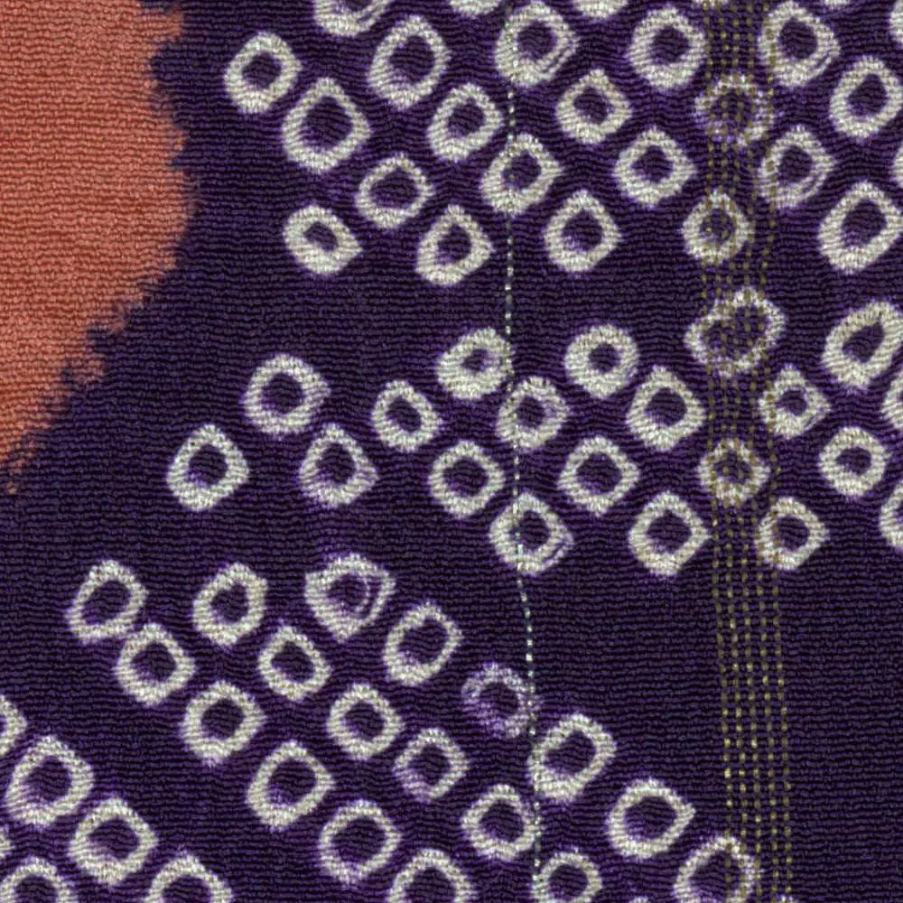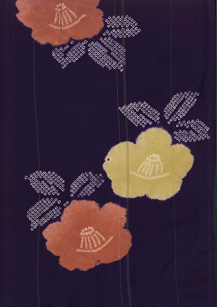 The detail images reveal the remarkable technical achievement of the shibori process, where tiny bound circles create a stippled texture that gives depth and movement to what might otherwise be flat color fields. This technique transforms the textile surface into something almost pointillistic, where individual dots of resist-dyed pattern coalesce into larger floral forms when viewed from a distance.