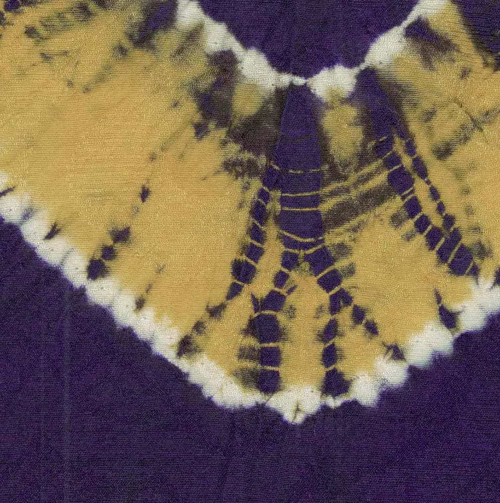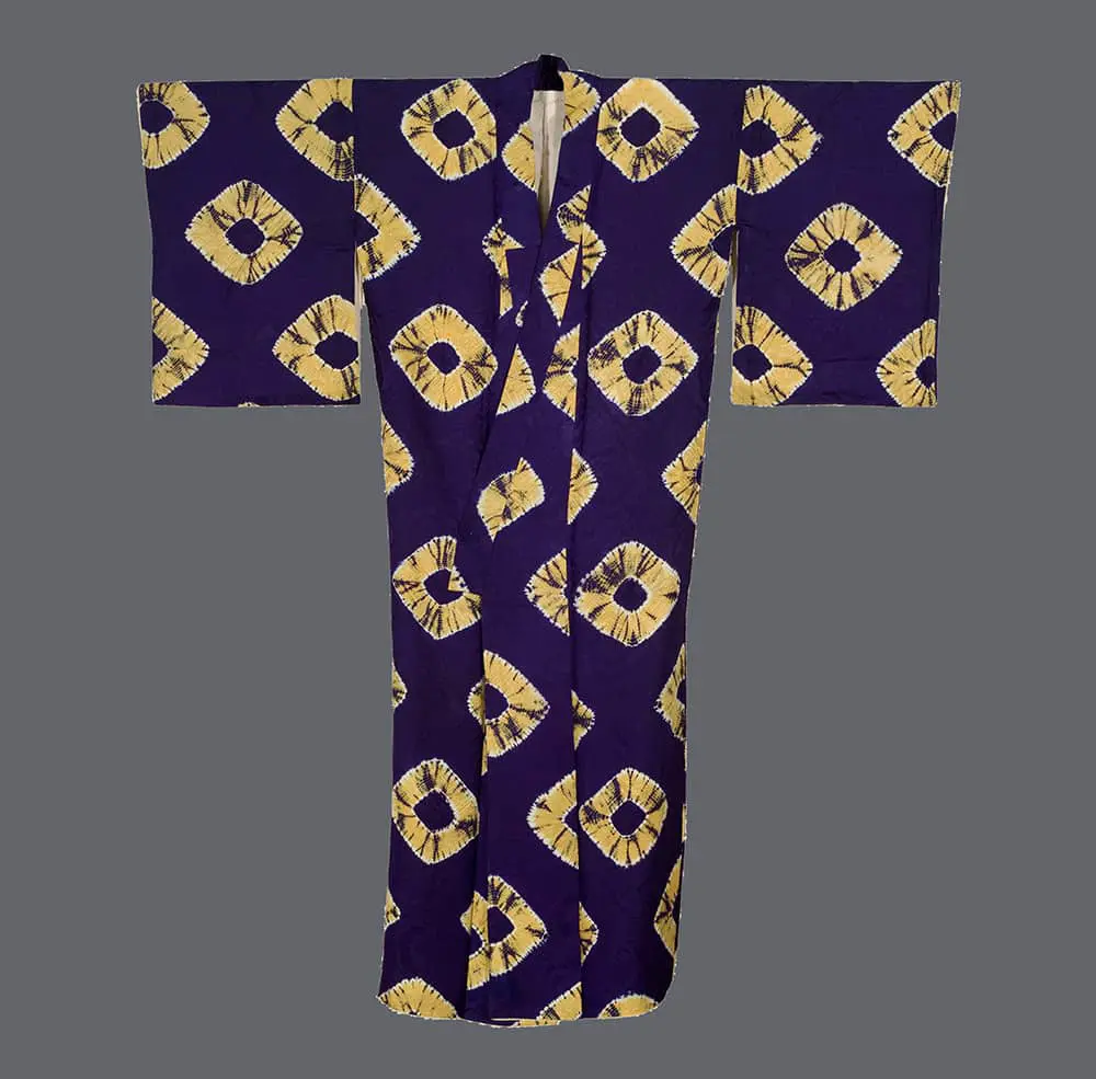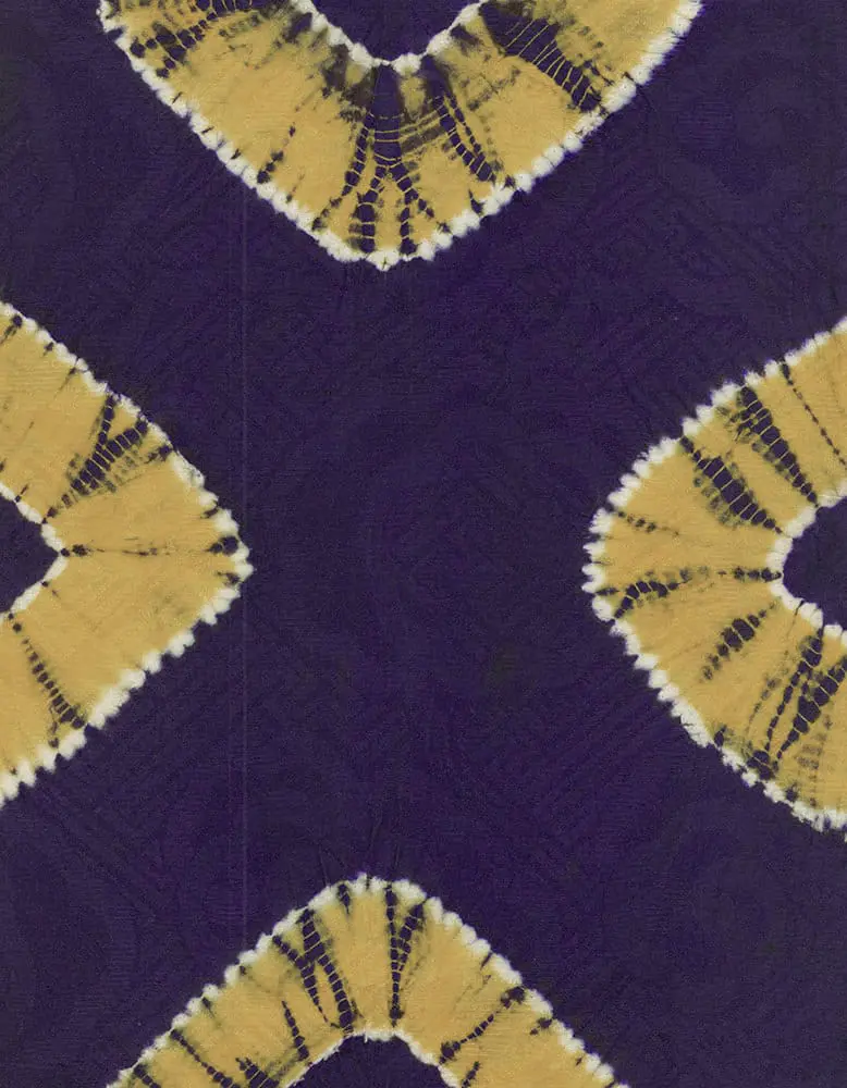 The interplay between the saturated purple ground and vibrant yellow creates a complementary color relationship that was increasingly popular during the 1920s and 1930s, reflecting exposure to Western color theory and modern art movements. The shibori technique itself, with its inherent irregularities and handmade character, provides a compelling counterpoint to the rigid geometric repetition, embodying the tension between tradition and modernity that characterized Japanese culture during this transformative era.