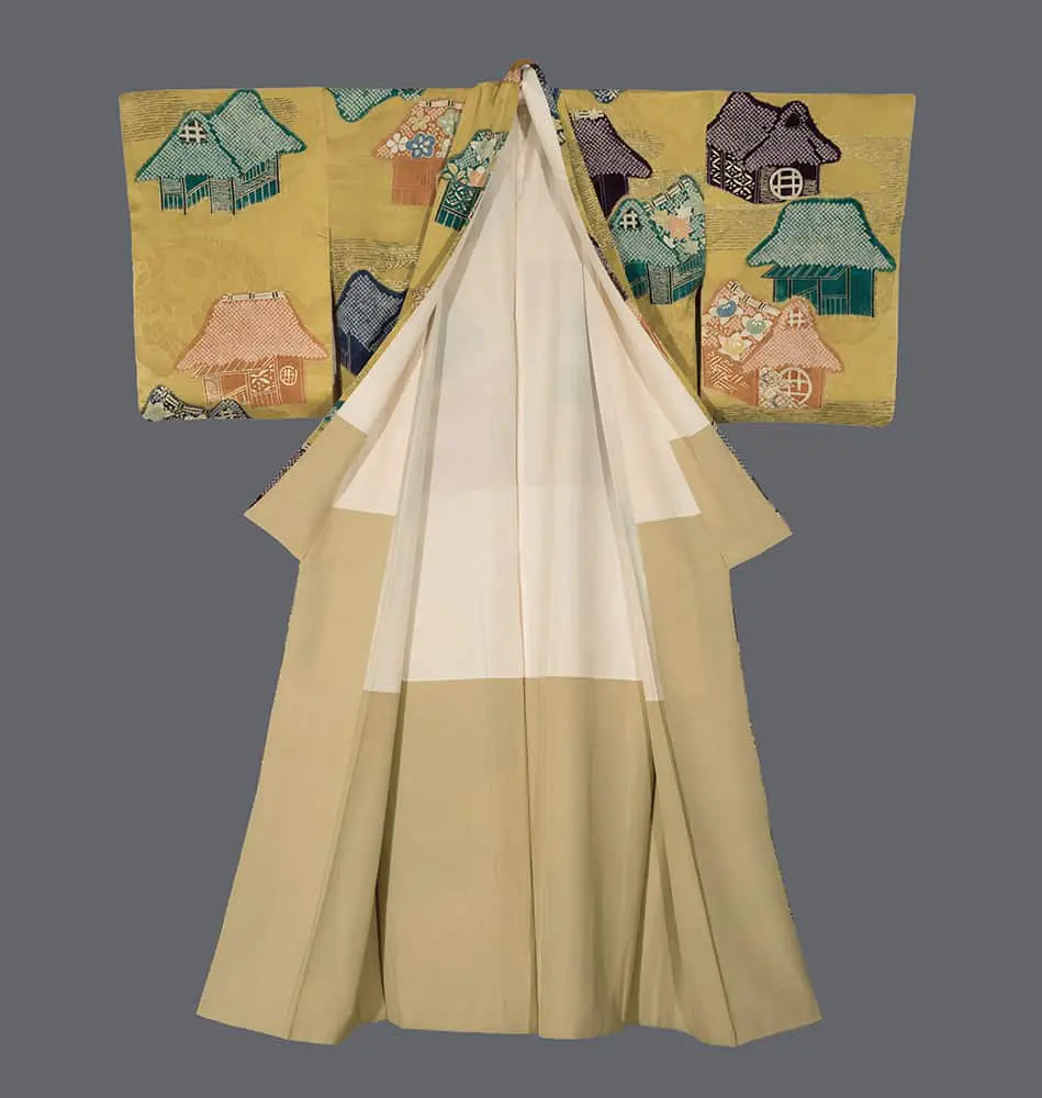 The scattered composition of houses across the kimono's surface creates a sense of movement and discovery, inviting the viewer's eye to travel across the garment and discover new details with each viewing. This approach reflects the Japanese aesthetic principle of ma (negative space) and the importance of balance between decorated and undecorated areas.