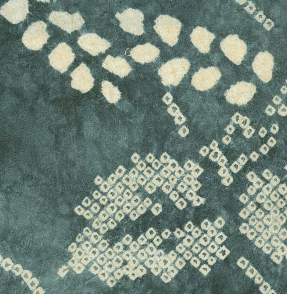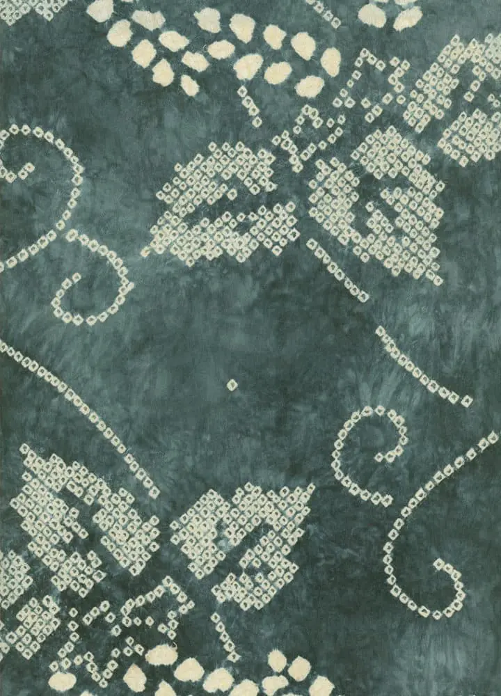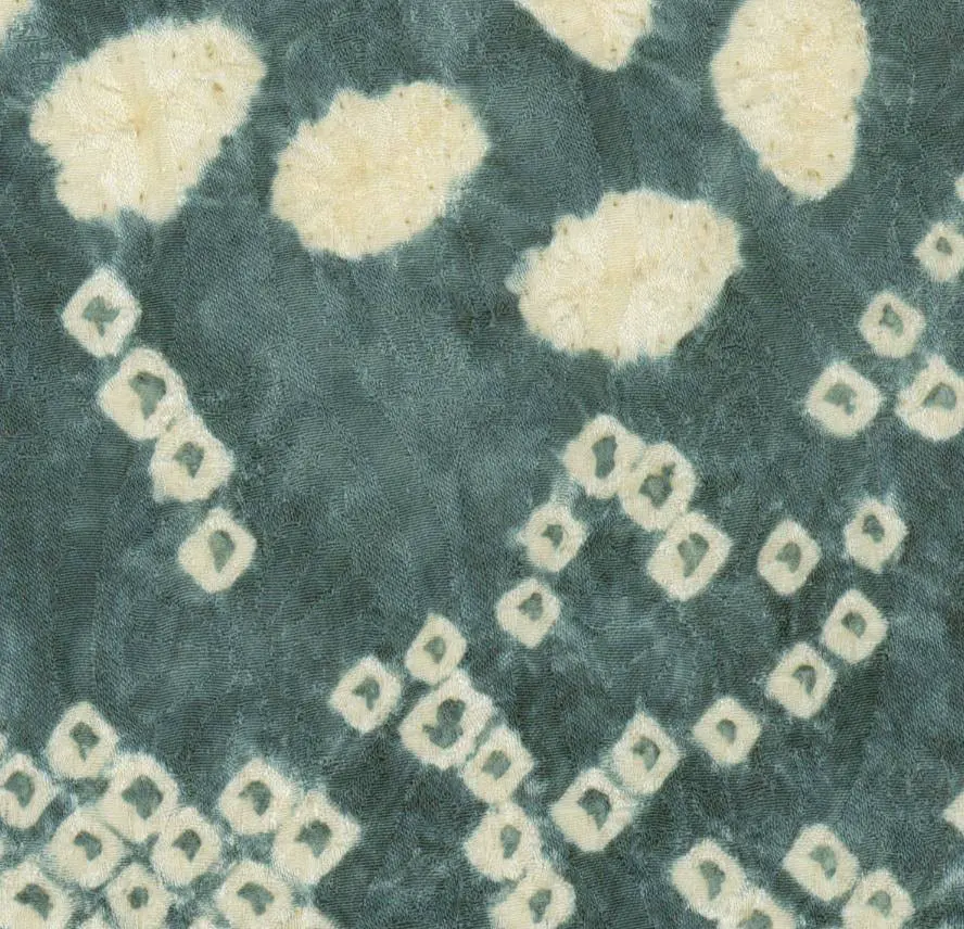 The artistic achievement lies in the sophisticated interplay between multiple levels of pattern and texture, where the woven swirl patterns provide a subtle foundation for the bold shibori vines that dance across the surface. The deep teal ground allows the cream and white resist patterns to emerge with dramatic clarity, while the puckered texture would have caught and reflected light in constantly shifting ways as the wearer moved. This kimono embodies the Japanese aesthetic principle of mono no aware—the beauty of impermanence—as the irregular, hand-tied shibori patterns create variations that celebrate the human touch over mechanical precision. The vine motifs themselves symbolize growth, connection, and the intertwining of lives, making this garment particularly appropriate for celebratory occasions. The combination of these labor-intensive techniques demonstrates the continued vitality of traditional Japanese textile arts during the post-war period,.