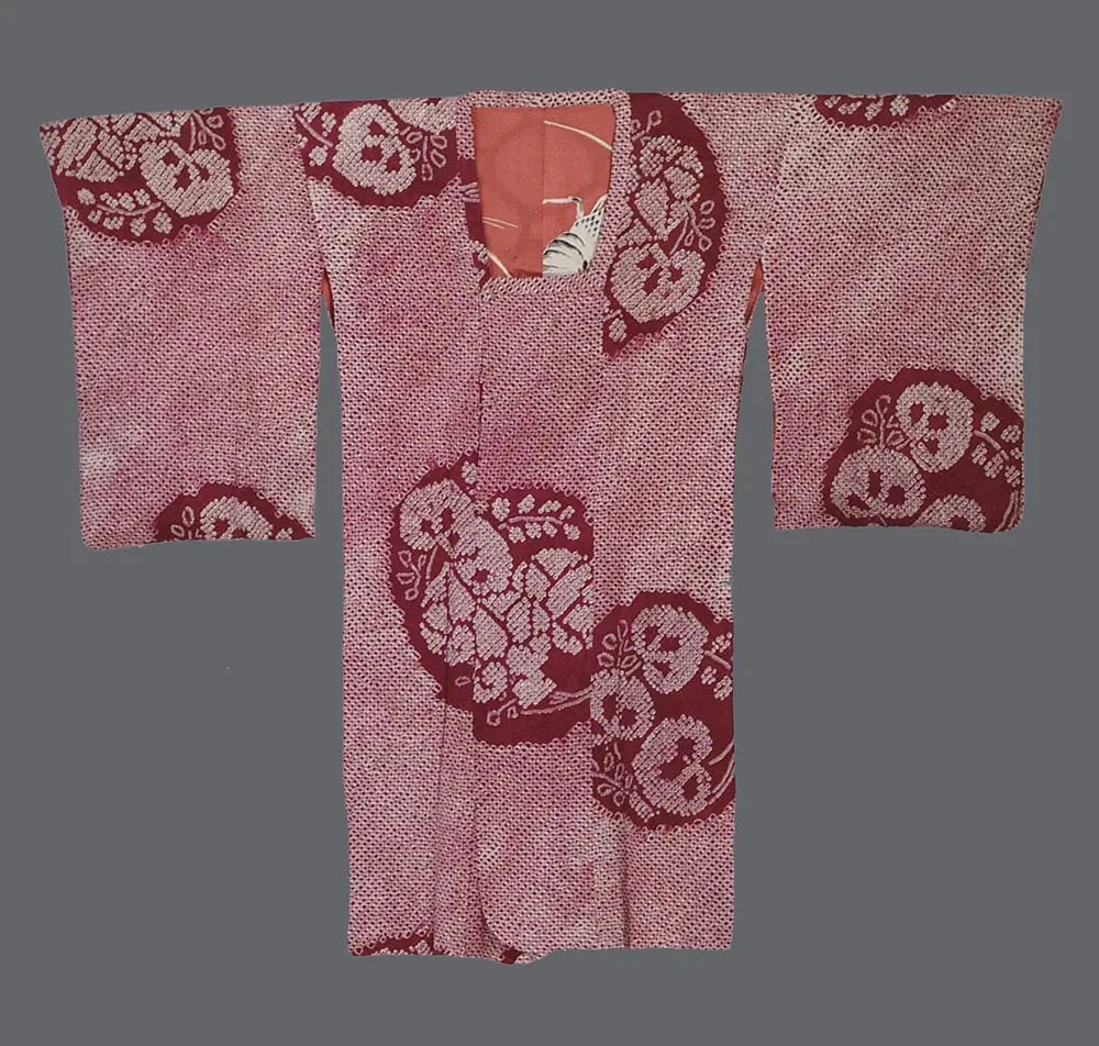 This silk shibori michiyuki, equipped with buttons and metal clips, is in excellent condition. Its measurements are approximately 47 inches (119 cm) from sleeve-end to sleeve-end and 43 inches (109 cm) in height.