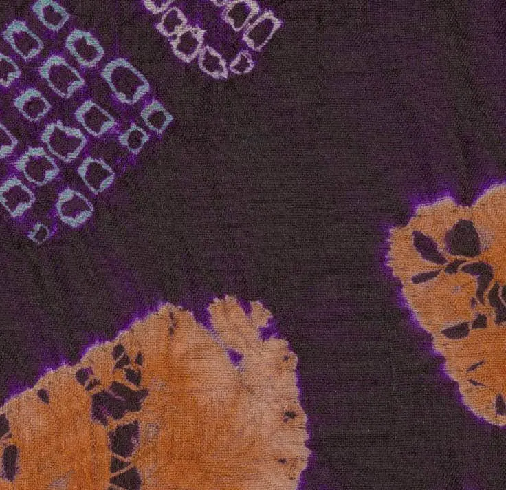 This haori features intricate shibori patterns that depict kiku (chrysanthemum), sasa (bamboo grass), and Genjiguruma (Genji cart) motifs. The color palette of this haori is a harmonious blend of deep purples and bright oranges, creating a striking visual contrast. The use of shibori adds depth and texture to the garment, enhancing the visual impact of the colors and patterns. The use of color blocking and geometric shapes in the pattern reflects elements of Art Deco, characterized by its emphasis on symmetry, bold lines, and striking contrasts. The geometric forms interspersed with the organic leaf shapes create a harmonious balance between structure and nature, a hallmark of Art Deco design. Additionally, the overall composition and use of vivid, contrasting colors bear similarities to the Fauvism movement, which celebrated the use of intense, non-naturalistic colors to convey emotion and energy. The vibrant orange and purple palette of the haori captures this spirit, creating a lively and dynamic visual impact. There's a hint of Japonisme in how it reinterprets traditional Japanese textile patterns through a more modern lens. The layered, overlapping elements and the way the design plays with positive and negative space could be seen as evoking Abstract Expressionism or even early Pop Art in its graphic quality.