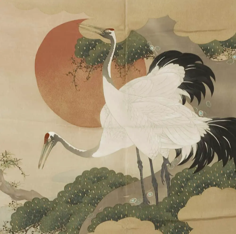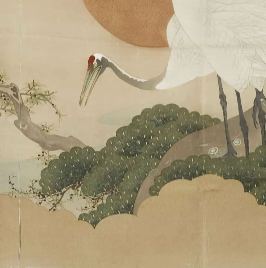 This silk fukusa, measuring 26 inches x 31 inches (66 cm x 79 cm), presents crane imagery through yuzen-dyeing complemented by sagara and simple embroidery highlights. While it exhibits some surface scuffing and silk splits on the extreme edges, it remains in generally good condition.