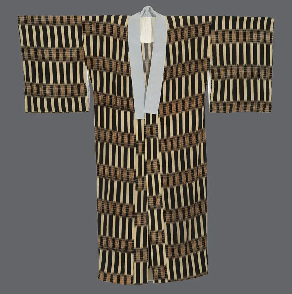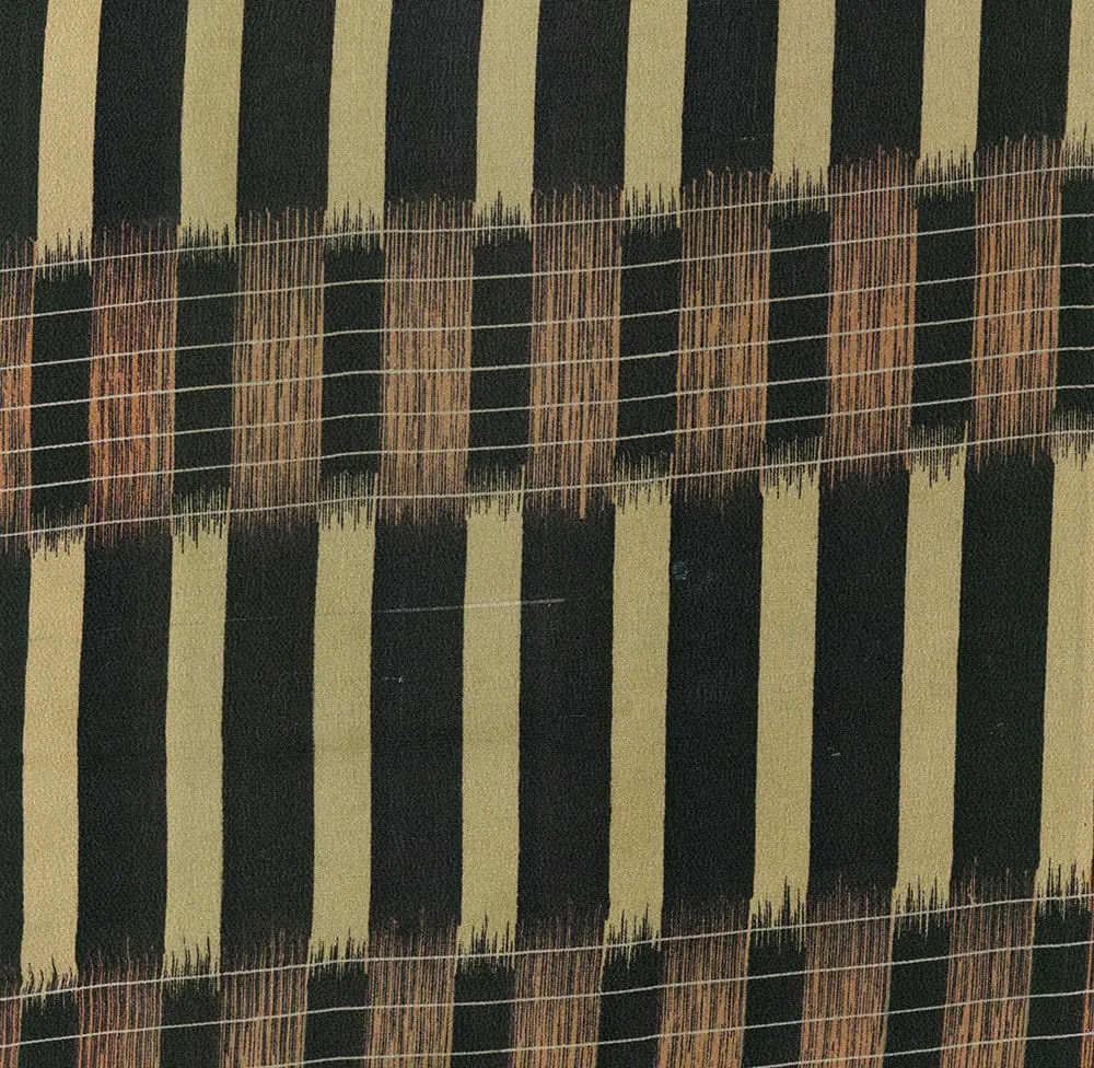 This chirimen silk underkimono (juban) bold geometric pattern of alternating black and cream stripes, punctuated by intricate crosshatched sections, demonstrates a striking departure from classical Japanese motifs toward a more modernist aesthetic that would later influence Art Deco and Bauhaus movements. This shift reflects the broader cultural transformation occurring during Japan's rapid modernization, when artisans began experimenting with Western industrial techniques while maintaining their mastery of traditional silk production.
