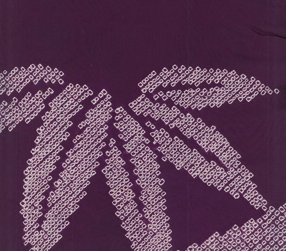 A synthetic material haori featuring bamboo leaves created utilizing the shibori technique. Very good condition, with minor imperfections. 49" from sleeve-end to sleeve-end x 37" height.