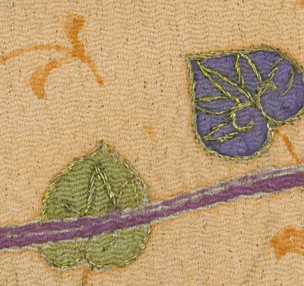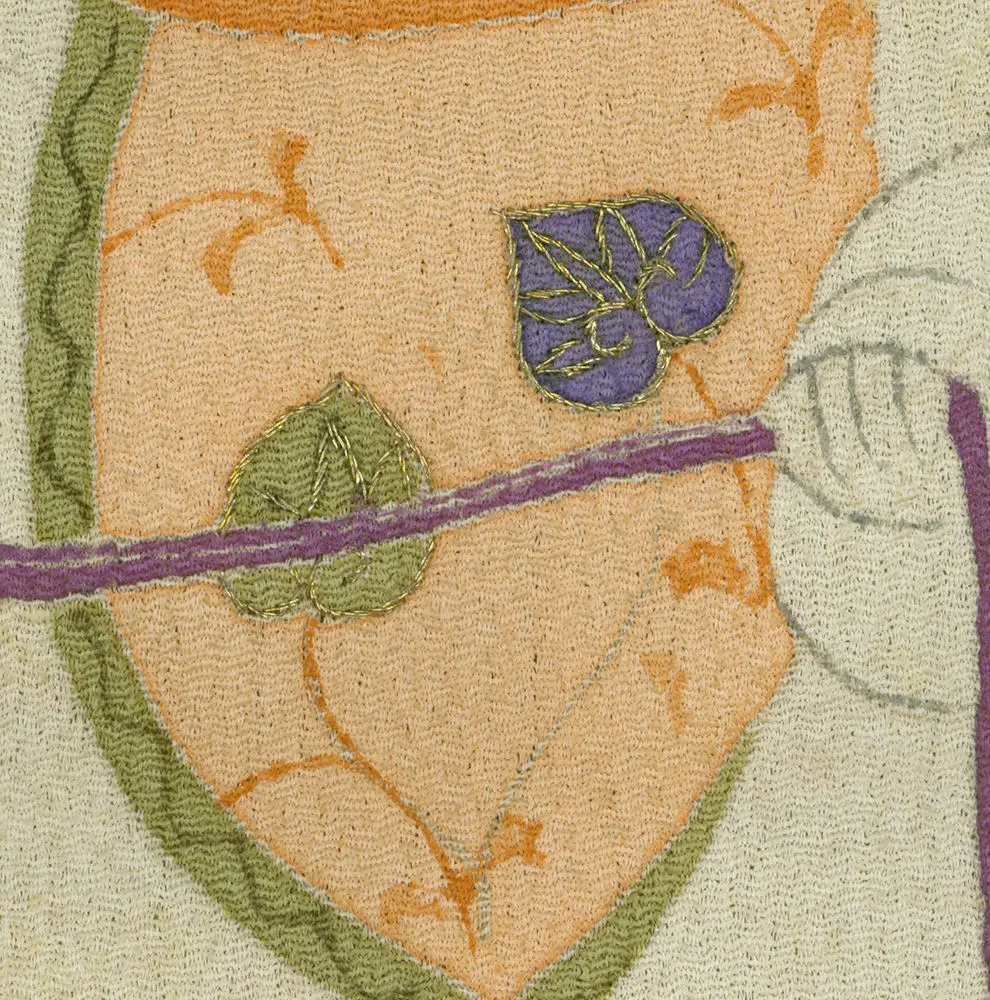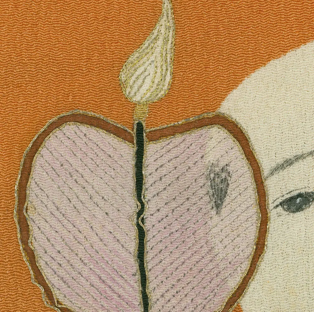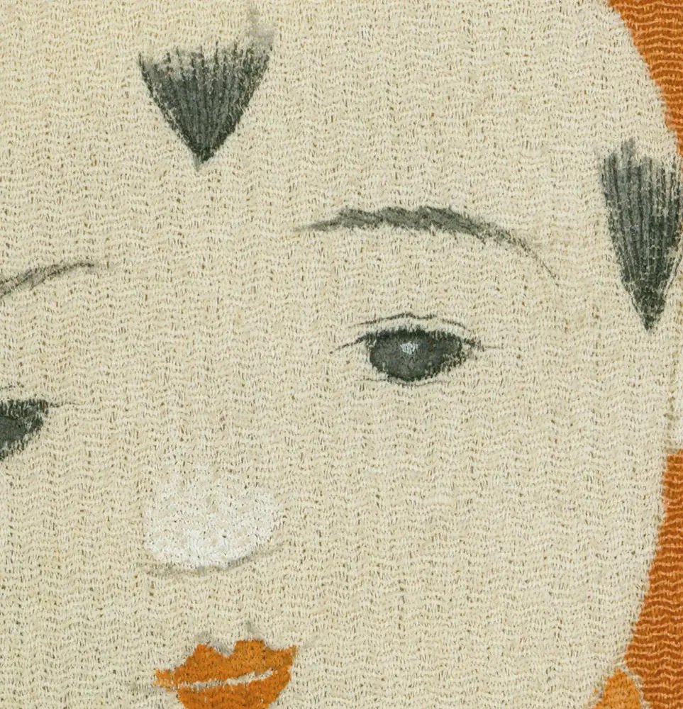 This rare chirimen silk mirror cover is a unique piece, measuring 19 inches by 43 inches (48 cm x 109 cm). It features three 'karako' children and a family crest, rendered through yuzen-dyeing with metallic embroidery highlights. The term 'karako' in Japanese art generally refers to small Chinese children depicted in traditional Chinese clothing.