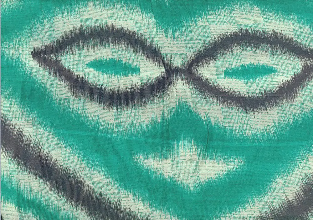 This silk sari is partially visible in the images, revealing about one-third of the textile. It's in very good condition overall and measures 44 inches by 180 inches (112 cm x 457 cm).