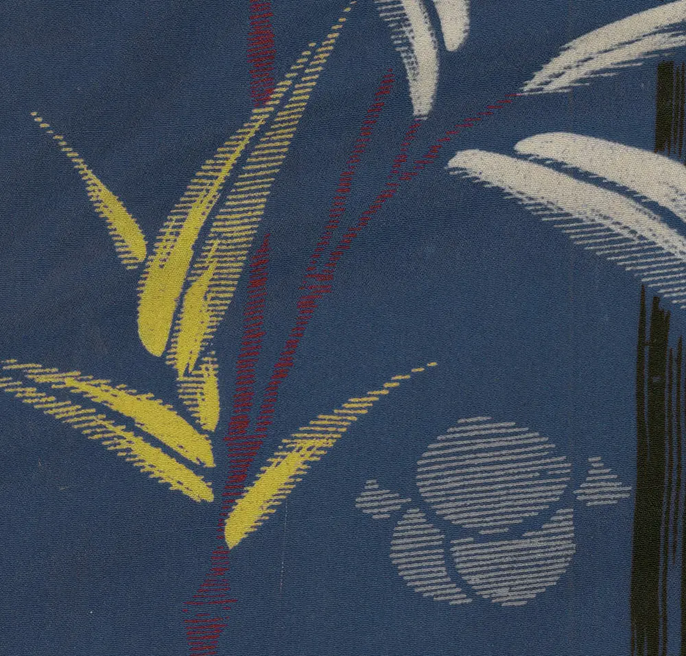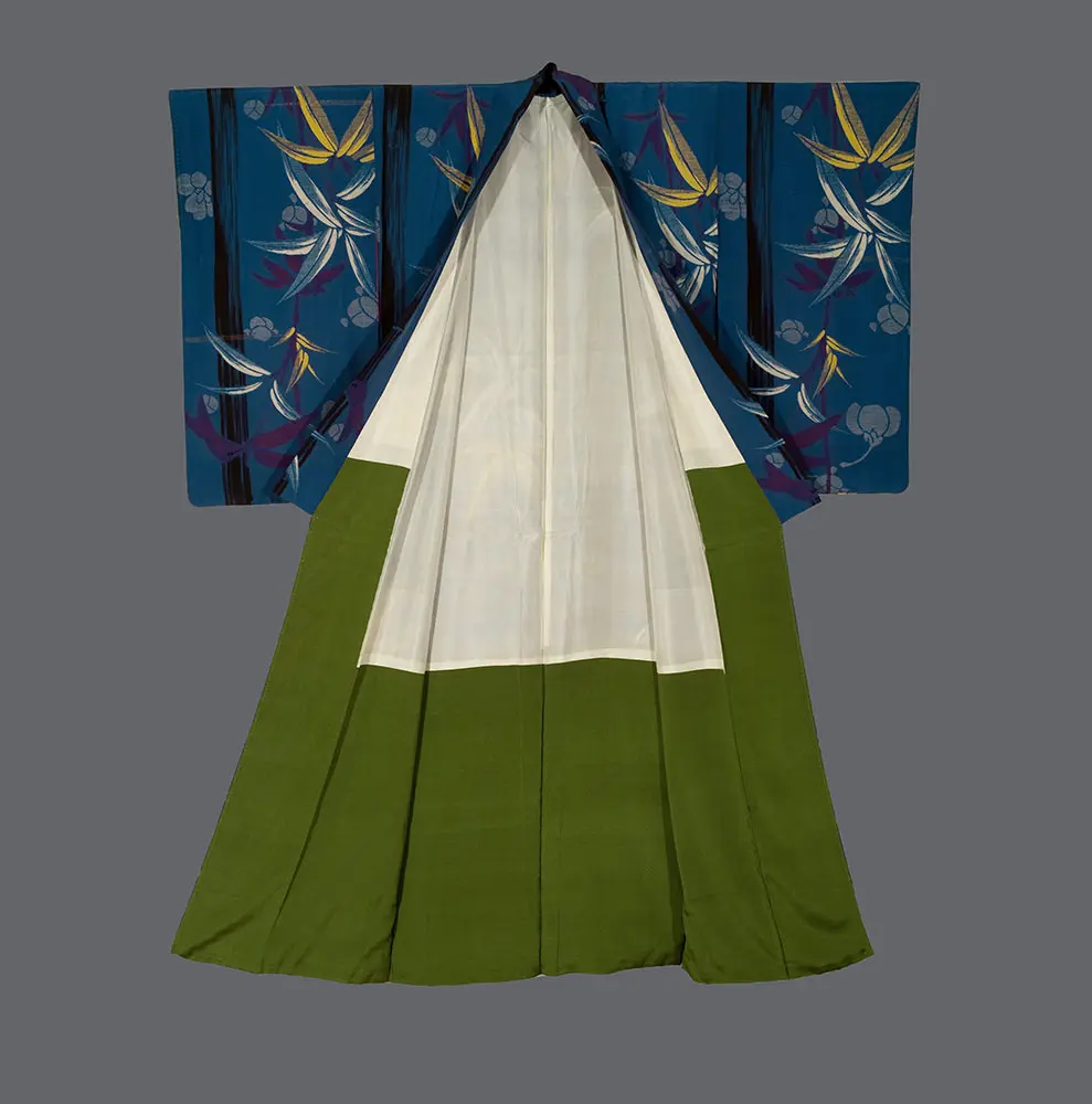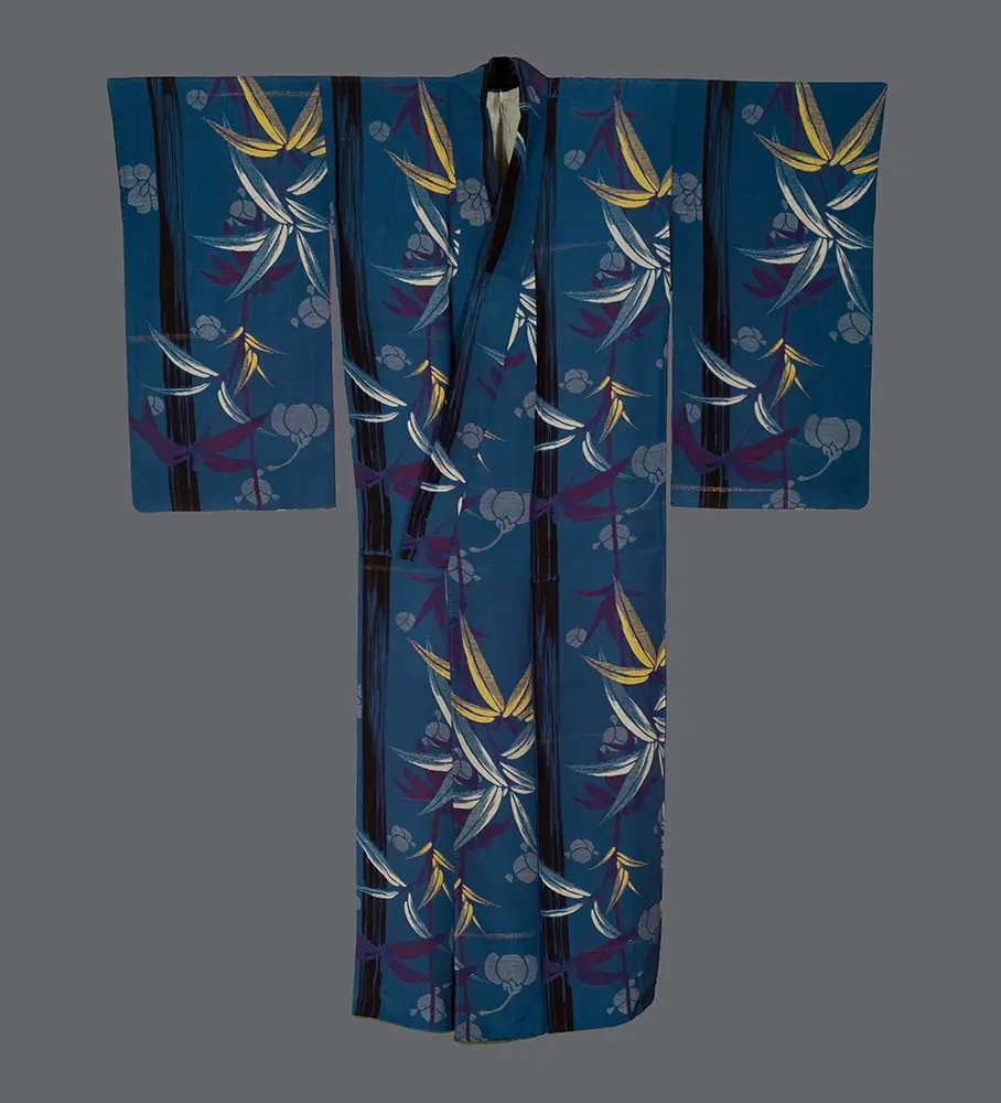 This kinsha silk kimono presents a harmonious botanical composition that exemplifies the Japanese aesthetic principle of seasonal celebration through textile design. The silkscreened pattern features an elegant interplay of sasa (bamboo leaves), ume (plum blossoms), and bamboo stalks arranged across a rich indigo ground, creating a design that evokes the transition from winter to spring. The motifs carry profound symbolic meaning in Japanese culture: bamboo represents resilience, flexibility, and rapid growth, while plum blossoms symbolize perseverance, hope, and the promise of renewal after winter's hardships. Together, they form one of the most auspicious combinations in Japanese decorative arts, representing endurance through adversity and the eternal cycle of seasons.