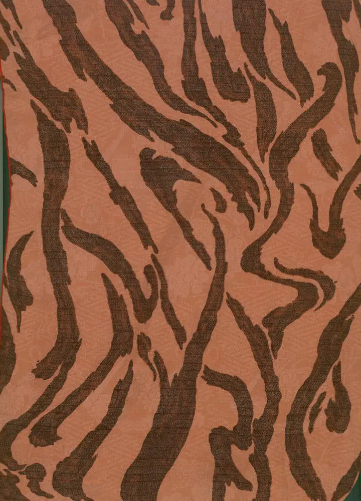 This rinzu silk kimono features a striking abstract pattern that evokes the Art Deco movement's characteristic emphasis on flowing, organic forms and rhythmic repetition. The silkscreened motifs appear as undulating, flame-like or wave-like forms rendered in deep brown against a warm terracotta background, creating a dynamic sense of movement across the textile surface. The pattern's fluid, curvilinear lines are reminiscent of both natural phenomena—such as flowing water, flickering flames, or wood grain—and the stylized organic motifs popular in Art Nouveau and early Art Deco design.