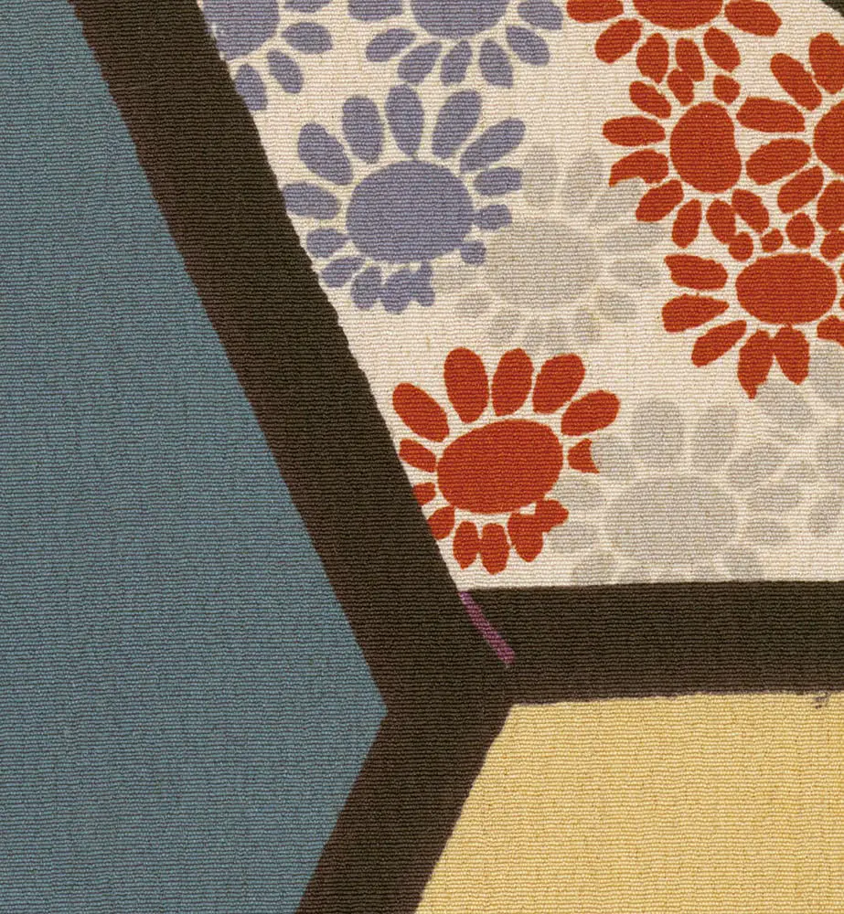 The detail images reveal additional layers of complexity within the design. Some of the diamond segments contain delicate floral motifs - small daisy-like flowers in various colors including purple, red, and green - that provide a charming contrast to the bold geometric framework. These tiny botanical elements, rendered on a cream background, add textural interest and demonstrate the sophisticated interplay between large-scale geometric design and fine decorative detail.
