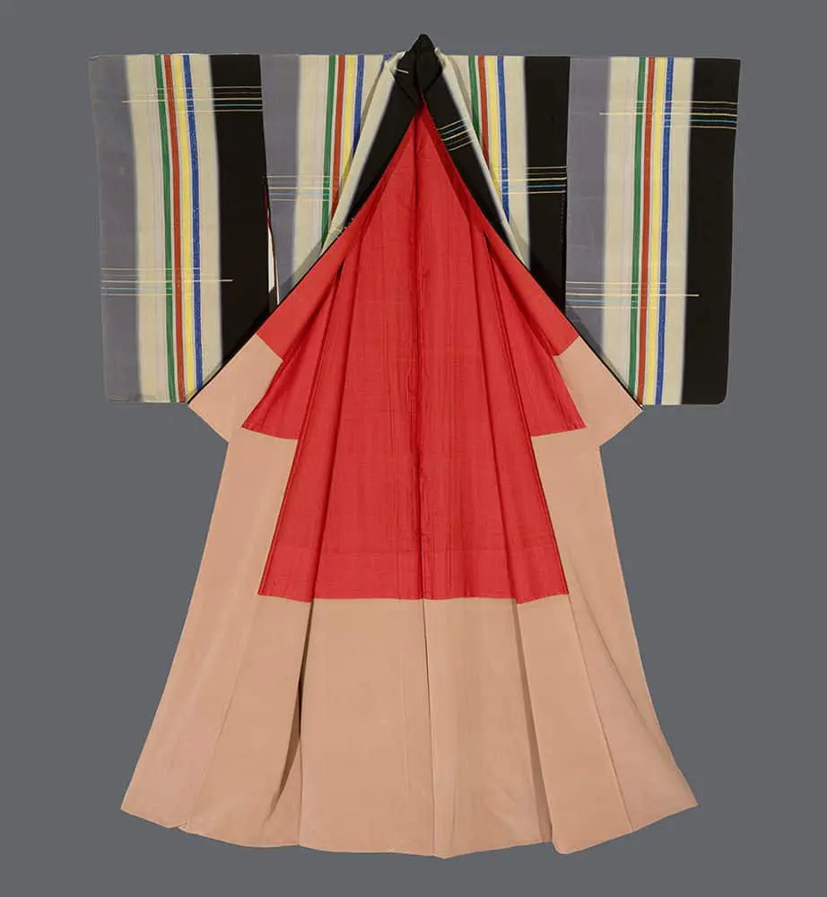 The kimono displays bold vertical stripes in a vibrant color palette including deep black, gray, blue, red-orange, and green, set against cream and white backgrounds. What makes this textile particularly remarkable is the intricate metallic threadwork - silver and gold supplementary threads create delicate horizontal accent lines that intersect with the vertical stripe pattern, forming a subtle grid or plaid effect throughout the fabric.