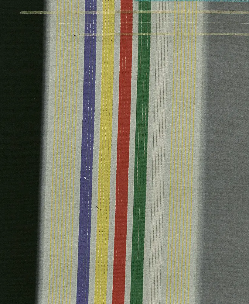 The detail images reveal the extraordinary detail of this weaving technique. You can see how the metallic threads are precisely integrated into the silk weave, creating fine horizontal lines that catch and reflect light. These supplementary threads appear as dotted or dashed lines, adding both textural interest and luminous quality to the fabric. The weaving shows exceptional technical skill, with the metallic elements perfectly aligned across the different colored stripe sections.