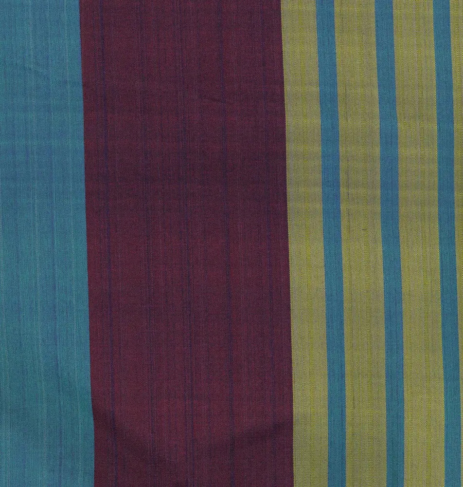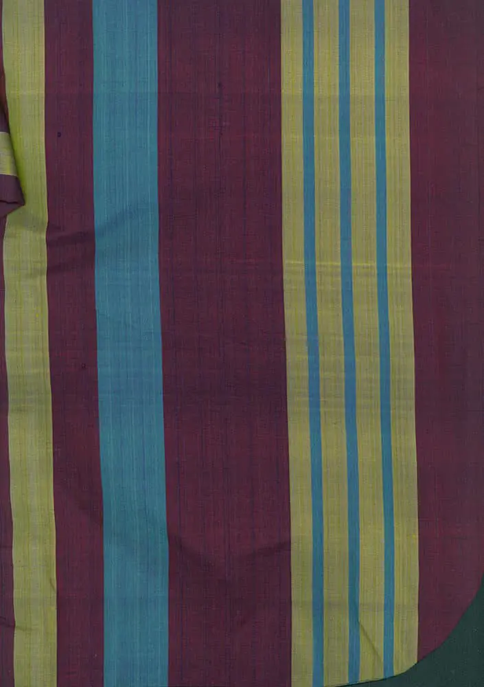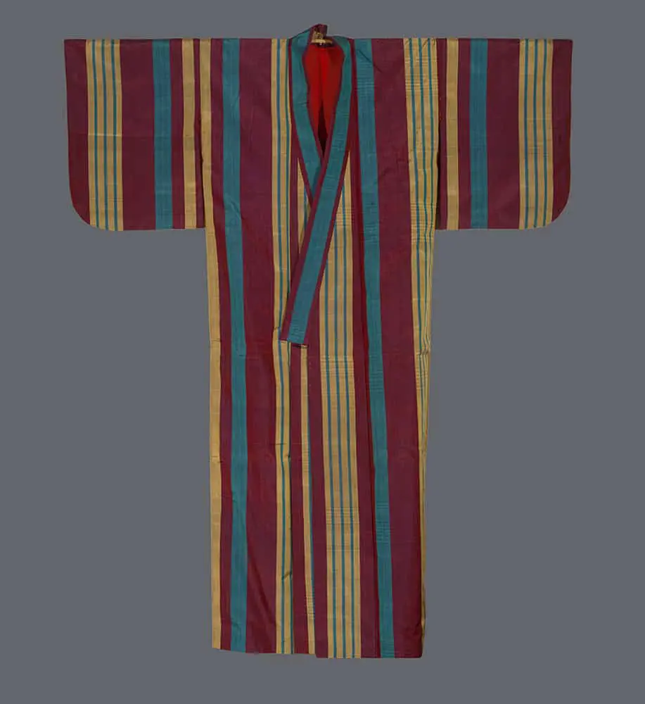 The artwork on this tsumugi silk kimono features bold vertical woven stripes in a harmonious repeating sequence of deep maroon, golden yellow, and teal blue-green, creating a rhythmic, geometric pattern that flows seamlessly across the garment's body and sleeves, with the satin shusu weave providing a glossy, smooth surface that enhances the fabric's luster and tactile depth. As a casual everyday garment crafted from hand-spun silk floss, it embodies the principles of the mingei folk art movement emerging in the 1920s and 1930s, which celebrated traditional Japanese crafts for their simplicity and authenticity amid rapid industrialization, while the clean-lined stripes also evoke the international Art Deco style of the era, characterized by vibrant colors, geometric abstraction, and luxurious materials that influenced global fashion including Japanese textiles. Though straight stripes (shima) lack the elaborate symbolism of figurative motifs, they often represent understated elegance and are linked to regional folk weaves like Oshima or Yuki tsumugi, symbolizing resilience and everyday harmony; the colors further layer meaning, with maroon red traditionally warding off evil spirits and denoting vitality, yellow conveying prosperity and happiness, and teal blue evoking the serenity of sky and ocean, together suggesting wishes for balance, good fortune, and well-being in the interwar cultural context.