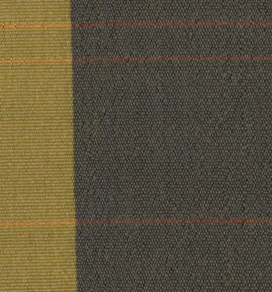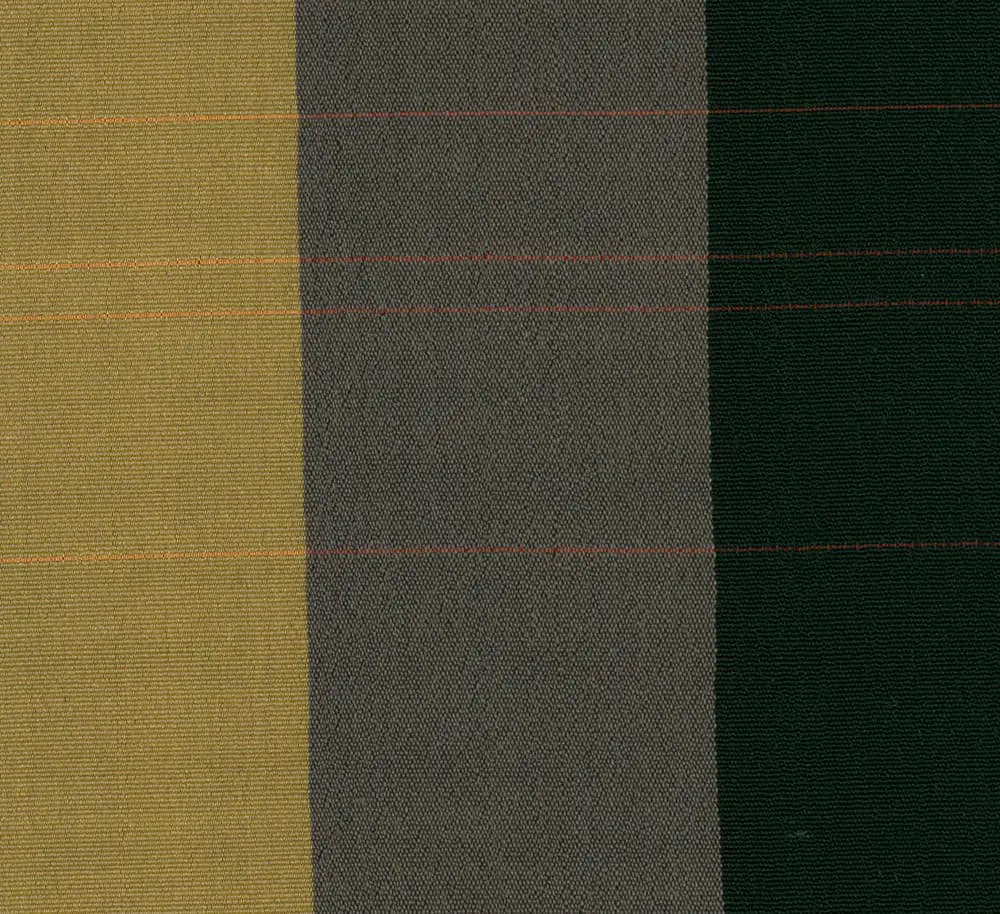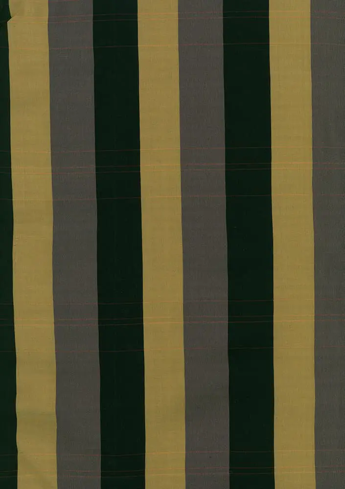 This kimono features a sophisticated vertical stripe pattern in a carefully orchestrated palette of earth tones. The stripes alternate between rich golden yellow, warm brown, muted gray-green, and deep forest green, creating a harmonious sequence that repeats across the fabric. The stripes are substantial in width and evenly spaced, giving the kimono a sense of architectural precision and formal dignity.
