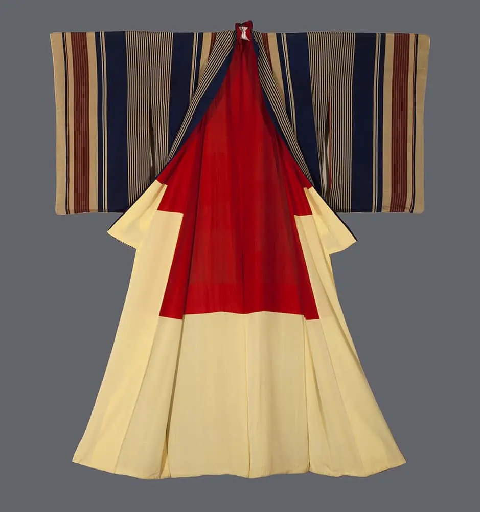 The kimono’s design distinctly evokes the aesthetics of Western art movements that were highly influential in Japan during this era, particularly Art Deco. The emphasis on clean, geometric lines, rhythmic repetition, and a strong, flat sense of pattern aligns perfectly with Art Deco principles. This period, often called "Taishō Roman," was characterized by a fusion of Japanese tradition with imported modernity. While a simple striped pattern does not carry the complex narrative symbolism of pictorial motifs like cranes or cherry blossoms, shima patterns were themselves a symbol of the chic, modern, and fashionable. Popular since the Edo period, stripes were considered a sophisticated and worldly design, expressing an aesthetic of iki, or effortless style.