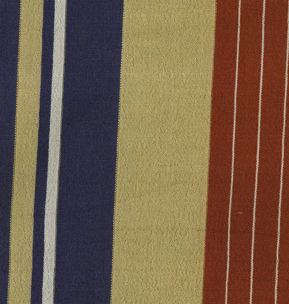 This silk kimono, features has a bold, graphic composition of its woven vertical stripes, a pattern known in Japan as shima. The choice of a strong, contrasting color palette—deep indigo blue, a rich terracotta brown, and a creamy off-white—gives the garment a confident and modern sensibility. The close-up image reveals the intricate texture of the silk weave, confirming that the stripes are integral to the fabric's construction, a testament to the textile's quality.