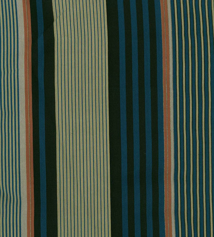 Most remarkably, woven within these stripes is a minute sayagata motif - a traditional Japanese geometric pattern of interlocking key-fret or swastika-like symbols that form a continuous, interconnecting design. This damask pattern is so subtle and finely executed that it creates an almost imperceptible secondary layer of decoration within the striped framework, visible mainly through slight variations in the silk's reflective quality.