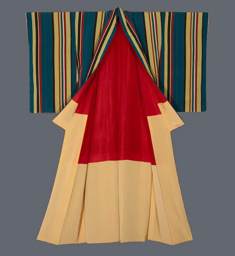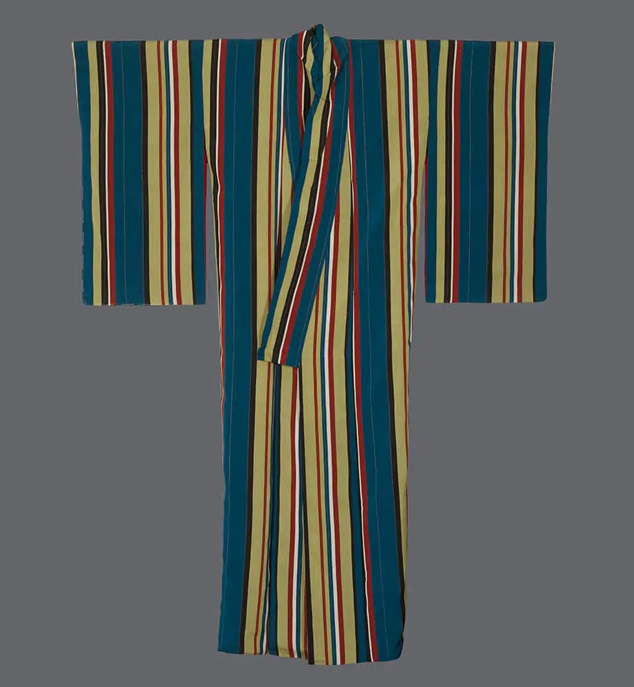 The kinsha (fine crepe) silk construction provides a subtle textural quality that enhances the visual richness of the stripes. The soft surface of the crepe silk would have created gentle light reflection, making the colors appear to shift slightly as the wearer moved. This type of refined striped kimono represents the Japanese aesthetic appreciation for understated elegance, where technical mastery in weaving and sophisticated color coordination create beauty through restraint rather than ostentation.