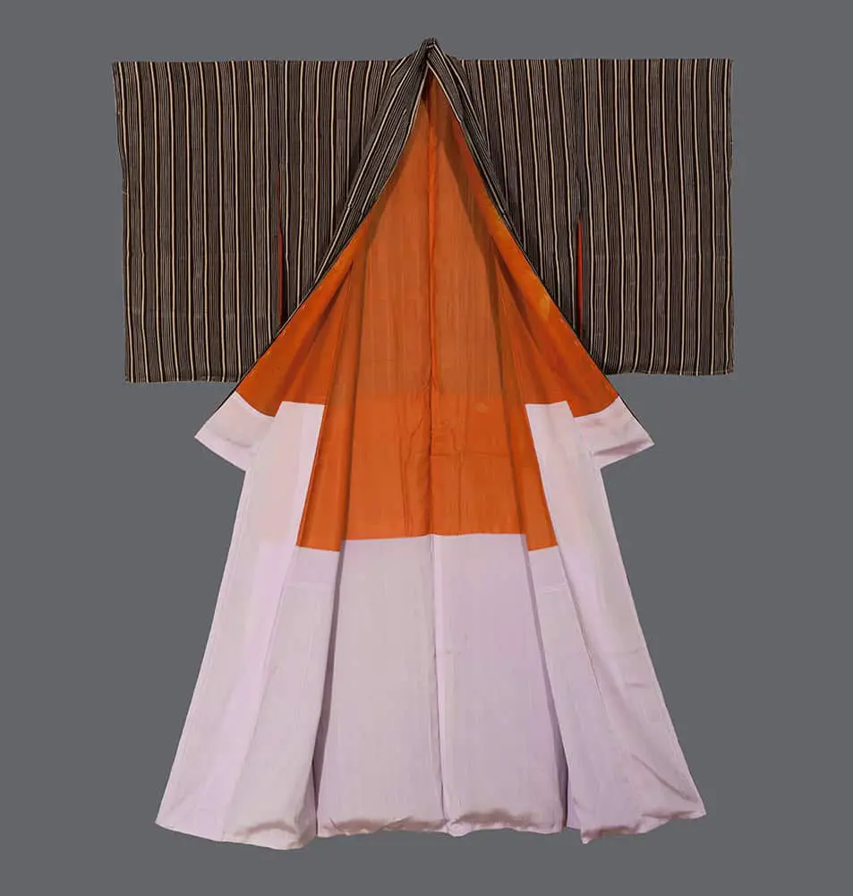 This kinsha silk kimono features katazome-produced vertical stripes that embody both traditional Japanese aesthetic principles and the period's embrace of sophisticated simplicity. The fine crepe fabric creates a subtle textural foundation for the precise vertical striping, which alternates between rich chocolate brown and cream tones in varying widths. This striped pattern, known as "shima," was a beloved motif throughout the 18th and 19th centuries, representing both continuity and progress through its clean, linear geometry.