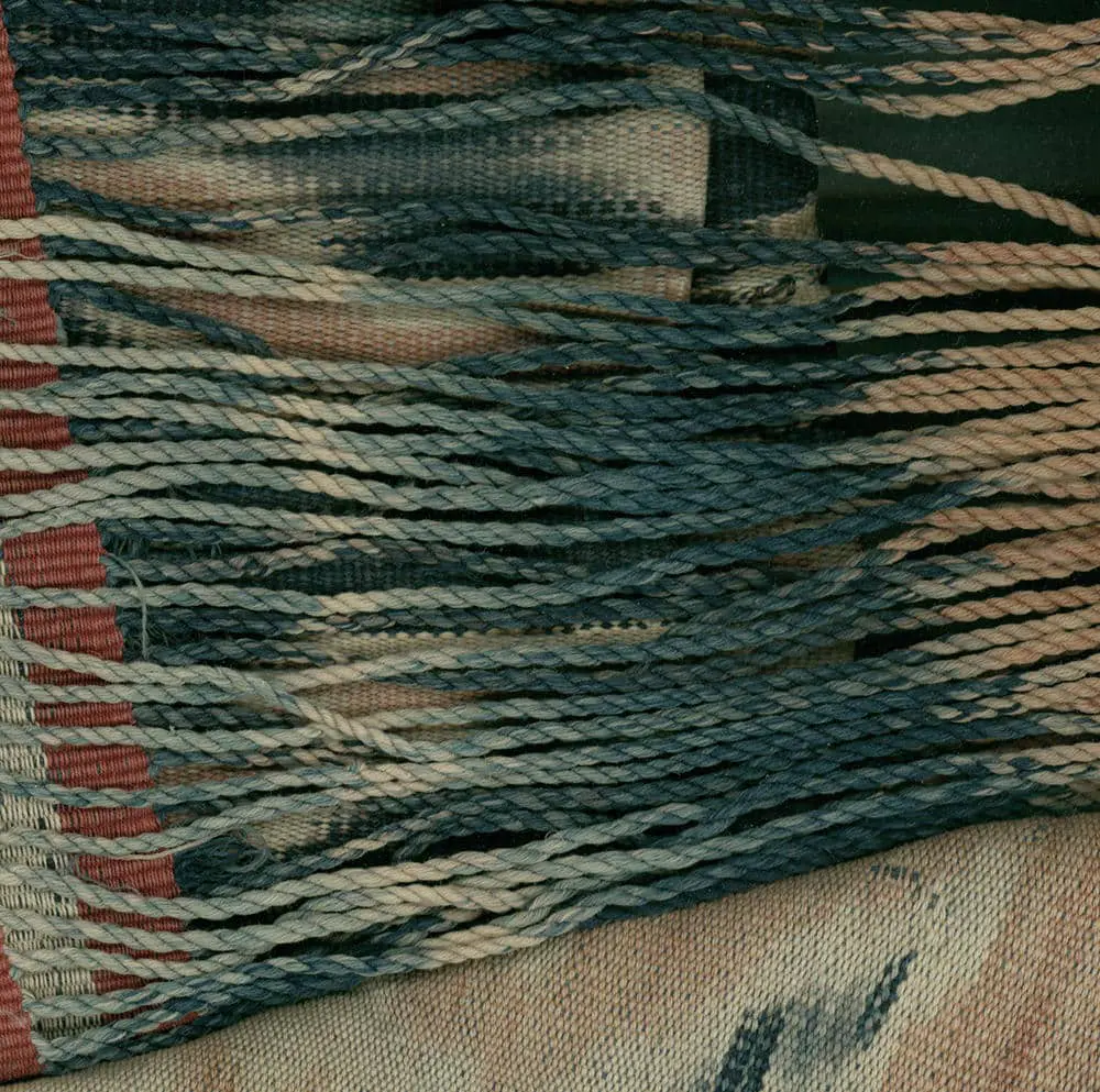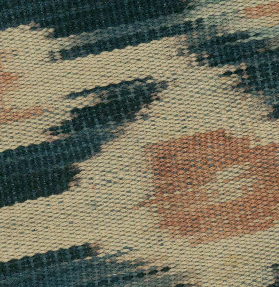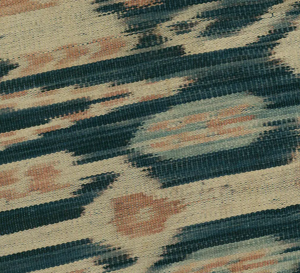 This older fine ikat hinggi from Sumba, Indonesia measures 46 inches by 102 inches (117 cm x 259.cm), excluding a 10-inch fringe. It's crafted from handspun cotton woven with exceptional fineness, characteristic of this type of garment. While it's in good condition overall, there are a few small holes present along with a 3-inch tear. Additionally, some fringing is missing, visible in the image on the left.