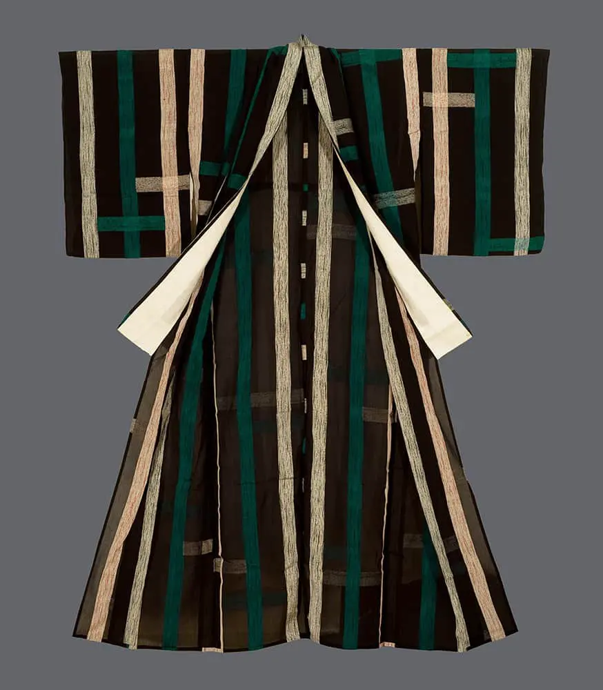 The design aesthetic strongly evokes the geometric abstraction of mid-century modern art movements, particularly the work of artists like Piet Mondrian or the Bauhaus school, with its emphasis on clean lines, rectangular forms, and a limited but sophisticated color palette. The intersecting vertical and horizontal elements create a sense of architectural structure that transforms the kimono into a wearable piece of abstract art.