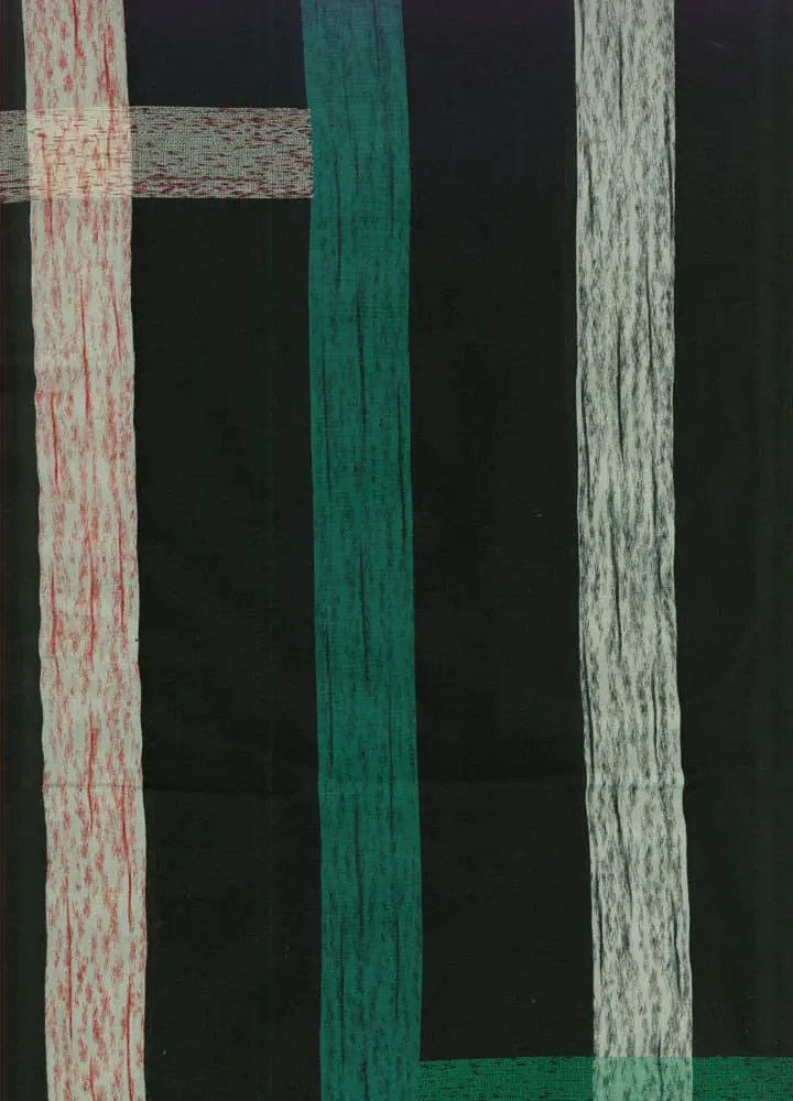 The detail reveals how the urushi threads create an almost pointillistic texture within the horizontal bands, adding both visual and tactile interest. This innovative technique produces a surface that catches light differently than traditional silk, creating subtle variations in tone and depth that animate the geometric composition.