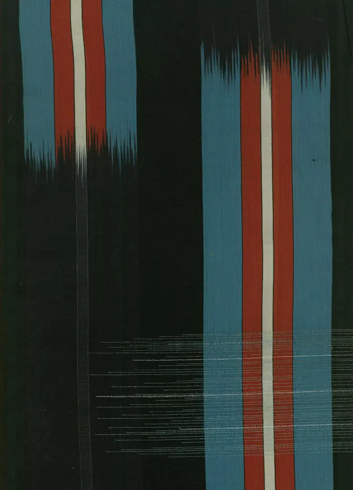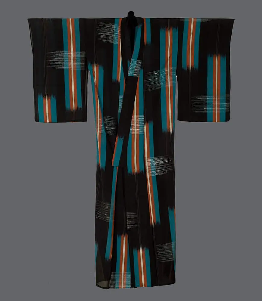 This kimono exemplifies the Taishō/early Shōwa period modernization of Japanese dress, when designers embraced international avant-garde movements while maintaining traditional construction methods. The result is a garment that could easily be mistaken for European Art Deco textile design, yet remains fundamentally Japanese in its execution and cultural context. The optical effects created by the intersecting vertical and horizontal elements demonstrate the period's fascination with industrial aesthetics and geometric abstraction.