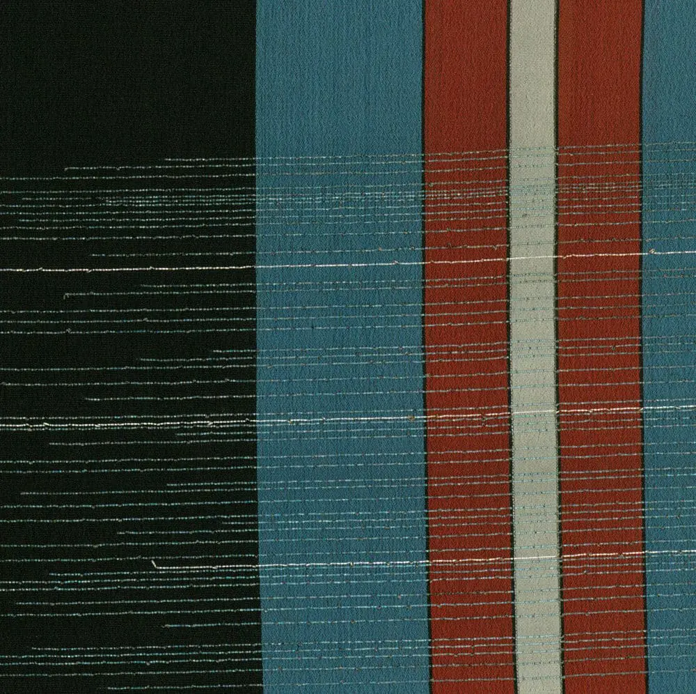 This textile represents a striking example of modernist geometric design in Japanese kimono from the interwar period. The garment displays a bold vertical stripe pattern in turquoise, coral-orange, and black against a dark ground, with distinctive horizontal silver thread supplementary inserts that break up the linear flow.