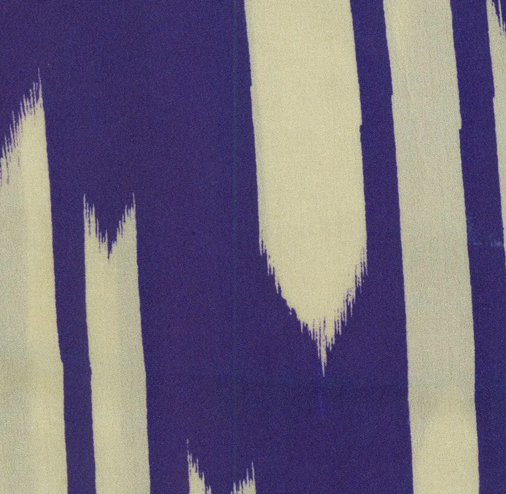 The artistic treatment of the yabane motif is thoroughly modern. The strong, geometric, and repetitive nature of the design shows a clear influence from the global Art Deco movement, which was enthusiastically embraced in Japan and became a key element of the "Taishō Roman" style. This aesthetic celebrated a romantic fusion of Japanese tradition with Western modernity. The technique employed—silkscreening to create a faux ikat—is itself a hallmark of this synthesis. As the close-up reveals, the edges of the motifs are intentionally blurred, mimicking the feathered appearance of true ikat, a laborious traditional resist-dyeing method. Using the modern technology of silkscreening to achieve this celebrated traditional look made such bold designs more accessible and speaks to the period's innovative spirit. The result is a striking garment that transforms a classic Japanese symbol into a powerful piece of graphic art, perfectly capturing the forward-looking and eclectic energy of its time.