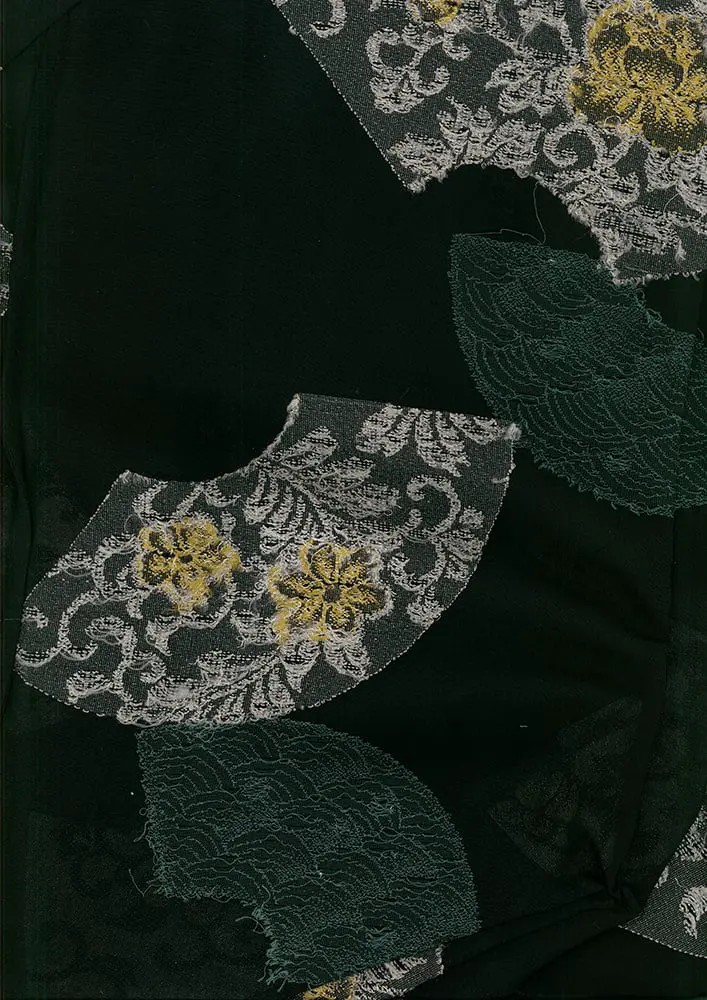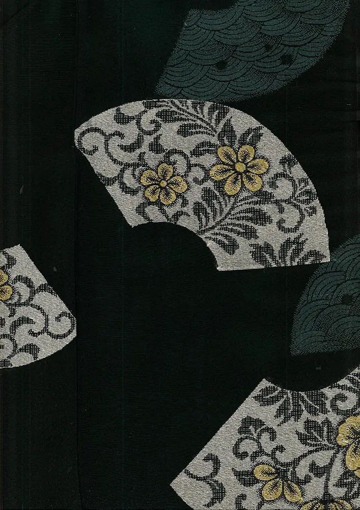 This unlined semi-transparent summer kimono, notable for its fan motifs crafted with urushi coated and metallic threads, showcases a unique texture that's more gritty than silky. It maintains a very good condition and measures 49 inches (124.5 cm) from sleeve-end to sleeve-end, with a height of 59 inches (149.9 cm). Detailed closeups in the provided images illustrate the intricate techniques used to create the fan motifs, highlighting the exquisite craftsmanship of this elegant garment.