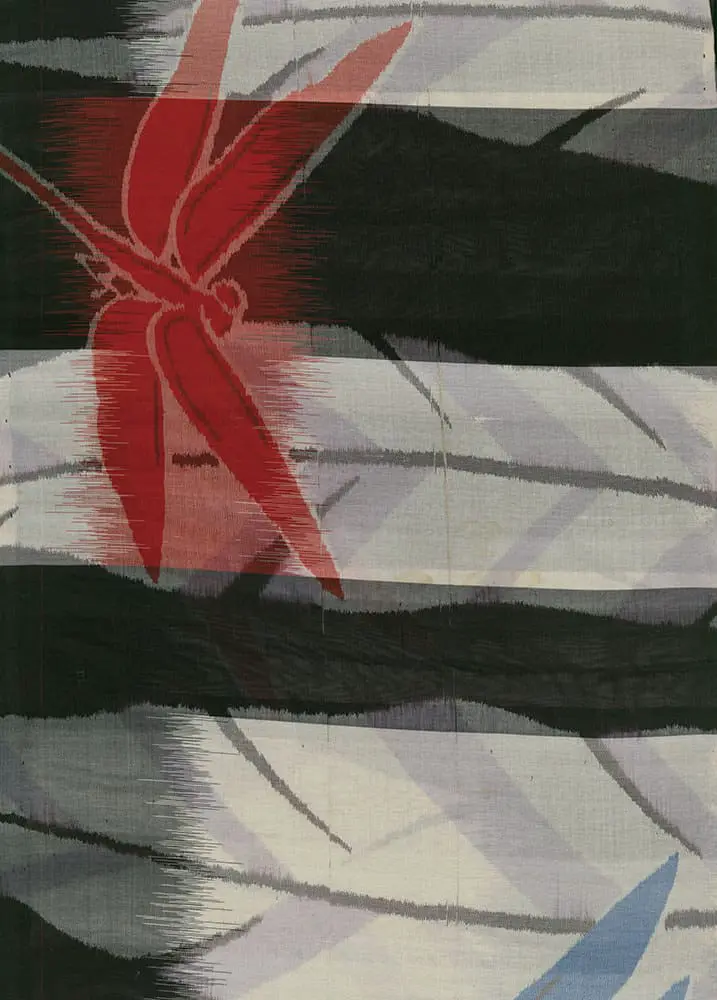 This mid-20th century summer kimono presents a striking modernist interpretation of traditional Japanese motifs, showcasing the innovative design approaches that emerged during the meisen textile boom of the 1920s-1960s.
