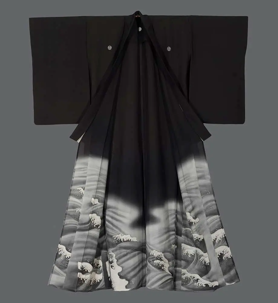 This silk kurotomesode combines multiple sophisticated techniques to create a dramatic seascape of remarkable power and beauty. The garment's design strategy is particularly striking - the upper portion maintains the formal black ground expected of kurotomesode, while the lower section transforms into a turbulent ocean scene that seems to surge upward from the hem.
