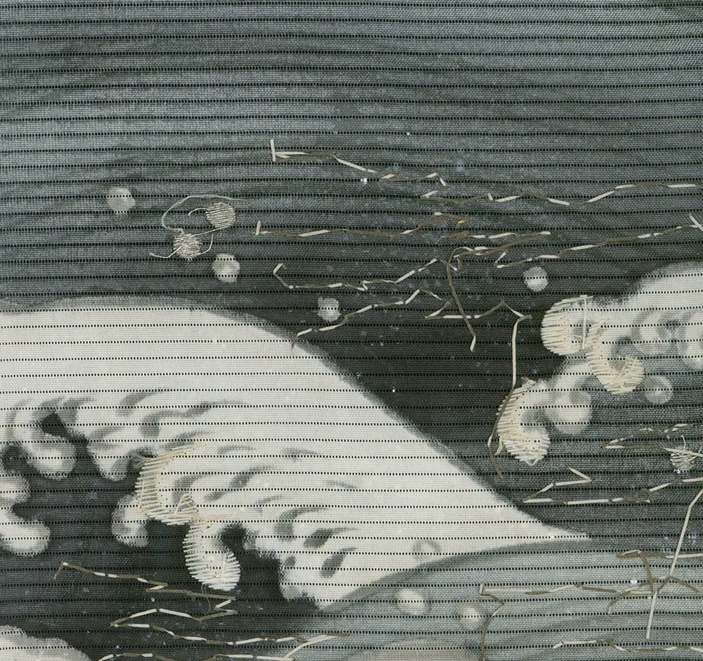 The technical execution is particularly noteworthy in how different methods work together seamlessly. The broad wave forms are established through yuzen resist-dyeing and sumi-e painting techniques, creating the flowing water patterns and tonal gradations. Over this foundation, satin stitch embroidery adds dimensional texture to the wave crests, while silver-metallic simple stitch embroidery provides highlights that catch light like actual sea foam and spray.