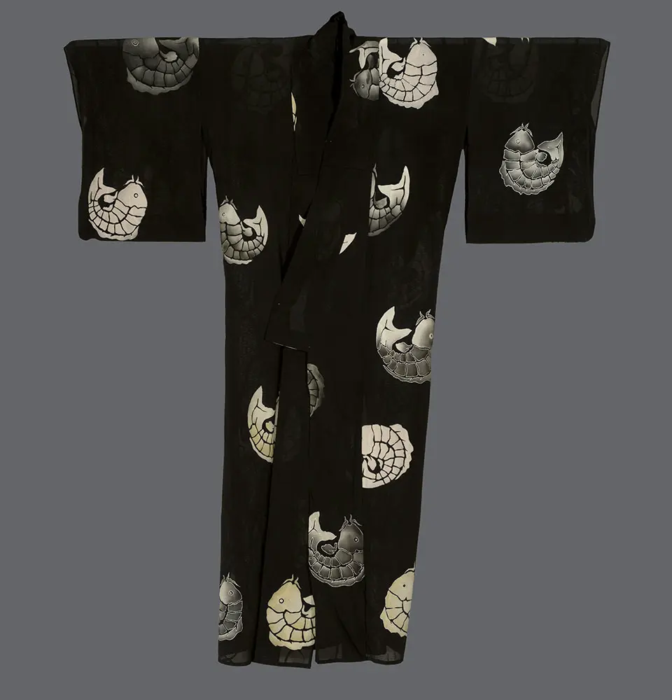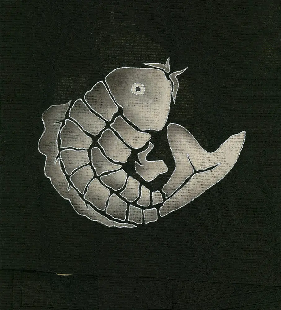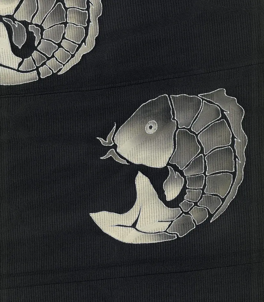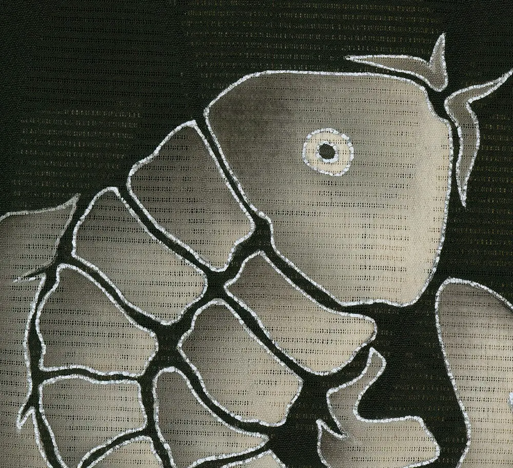 The design philosophy echoes the principles of Art Deco with its strong contrast between the deep black ground and the pale, luminous fish, while the undulating damask patterns woven into the black silk create a subtle textural representation of flowing water that adds depth and movement to the composition. The carp themselves carry profound symbolic meaning in Japanese culture, representing perseverance, courage, and the ability to overcome obstacles. The sheer ro weave of the summer silk allows light to play through the fabric, creating an almost ethereal quality where the fish appear to swim through darkness, their forms highlighted by the interplay of transparency and opacity. This sophisticated interweaving of traditional symbolism with modernist design sensibilities exemplifies the period's synthesis of Japanese cultural values with contemporary artistic expression, resulting in a garment that is both timelessly elegant and distinctly of its era.