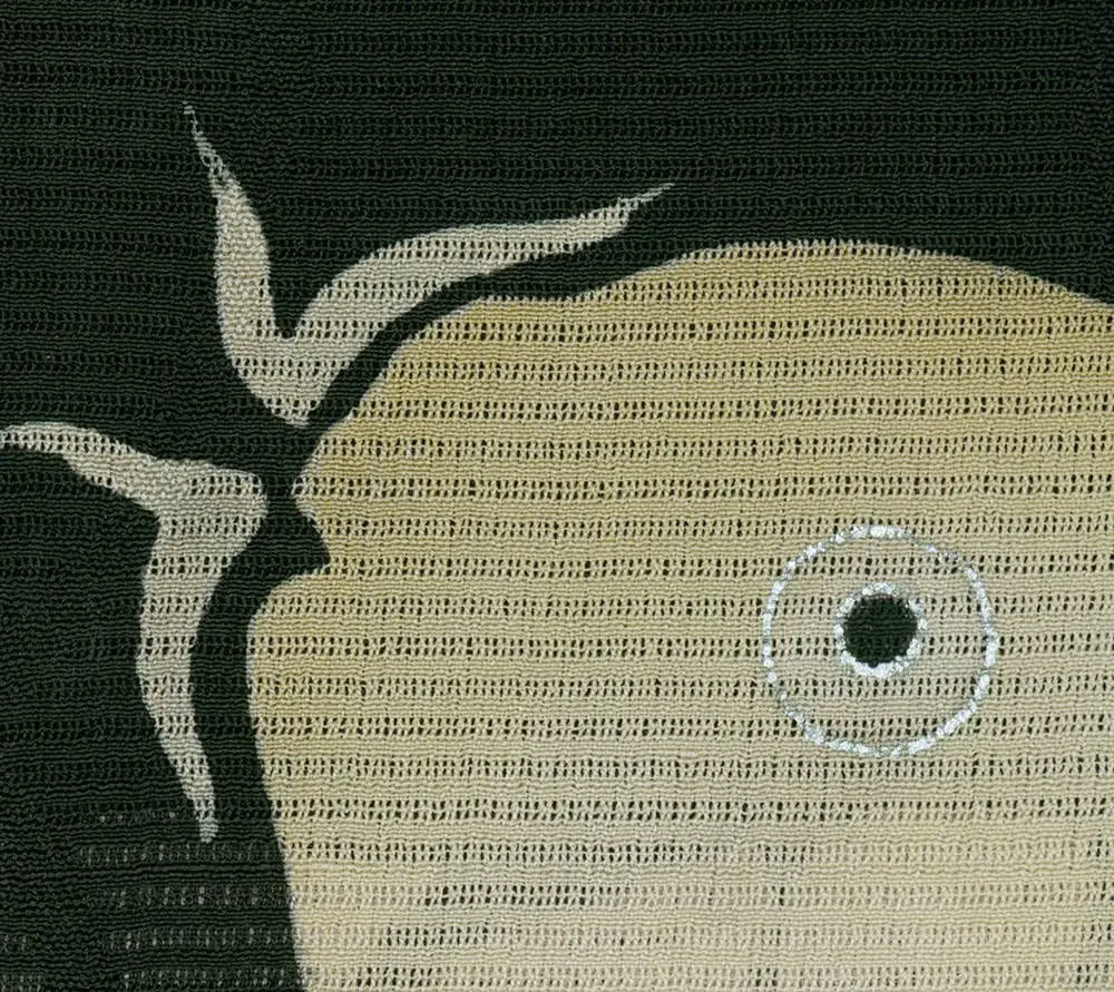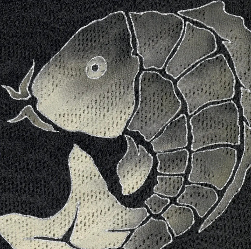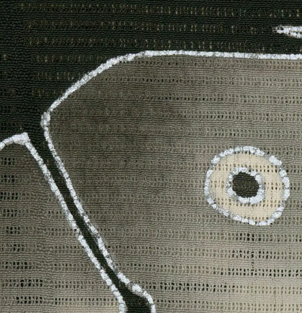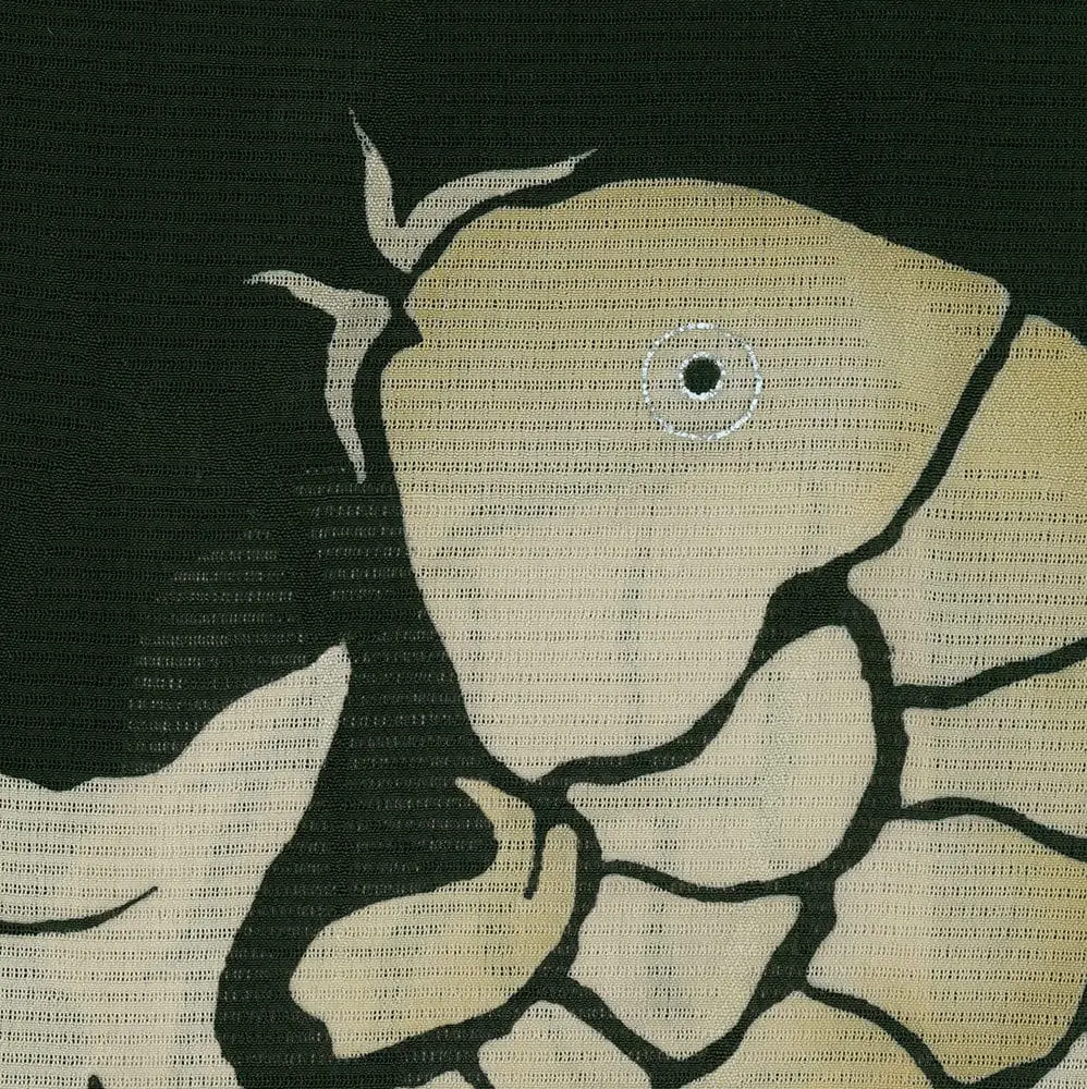 The design philosophy echoes the principles of Art Deco with its strong contrast between the deep black ground and the pale, luminous fish, while the undulating damask patterns woven into the black silk create a subtle textural representation of flowing water that adds depth and movement to the composition. The carp themselves carry profound symbolic meaning in Japanese culture, representing perseverance, courage, and the ability to overcome obstacles. The sheer ro weave of the summer silk allows light to play through the fabric, creating an almost ethereal quality where the fish appear to swim through darkness, their forms highlighted by the interplay of transparency and opacity. This sophisticated interweaving of traditional symbolism with modernist design sensibilities exemplifies the period's synthesis of Japanese cultural values with contemporary artistic expression, resulting in a garment that is both timelessly elegant and distinctly of its era.