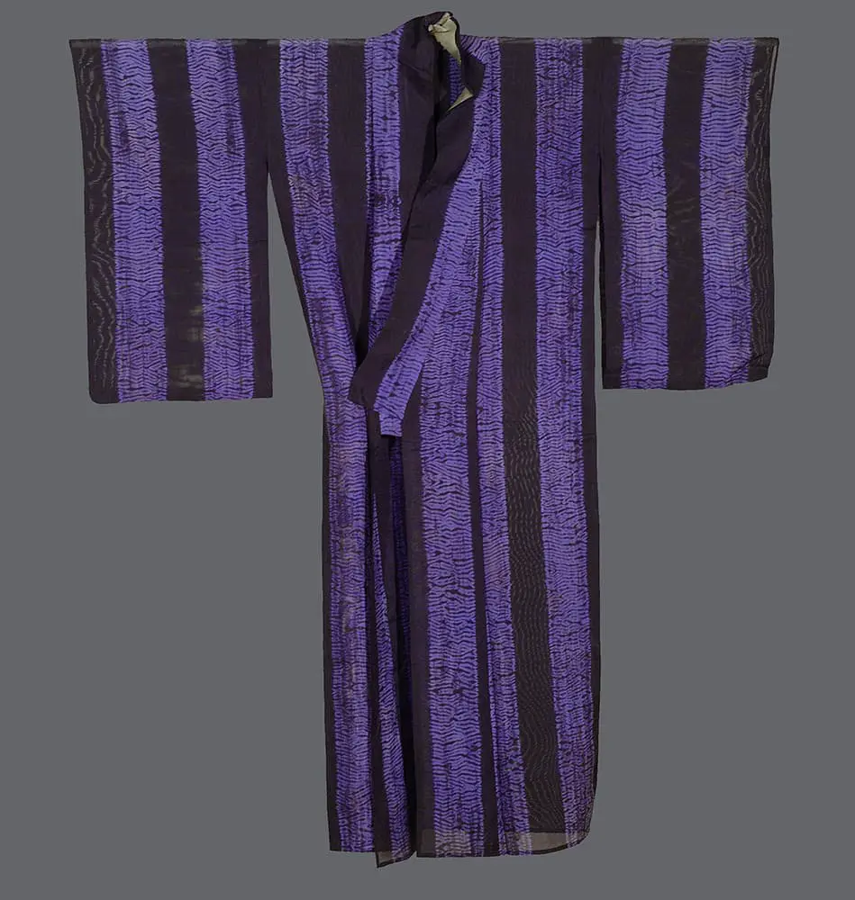 The choice of ro weaving technique—a loose, open-structure silk gauze—perfectly complements both the aesthetic and functional aspects of this summer garment, allowing air circulation while creating a subtle textural foundation that enhances the visual impact of the shibori work. The alternating pattern creates a dynamic rhythm that would have been particularly striking when worn, as the body's movement would cause the bands to shift and flow, animating the surface design. The purple and black color scheme reflects the period's embrace of more dramatic color combinations while remaining within the bounds of traditional Japanese aesthetics, where such bold contrasts were often tempered by sophisticated textile techniques. The shibori patterning within the purple bands adds layers of visual complexity that prevent the stripe pattern from becoming monotonous, demonstrating how traditional craft methods could be employed to create garments that were both functionally appropriate for summer wear and aesthetically aligned with the modern sensibilities of the interwar period.