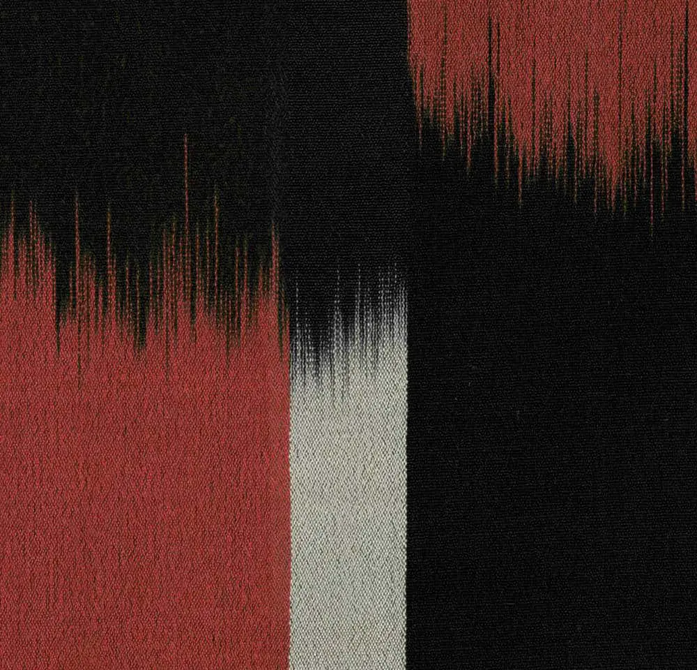 The composition reflects the influence of both Art Deco sensibilities and Japanese modernist design principles that were emerging during this period, when traditional textile artists began experimenting with bolder, more abstract patterns while maintaining their technical mastery. The vertical orientation of the stripes creates an elongating effect that would have been particularly flattering when worn, while the asymmetrical arrangement prevents monotony and adds visual interest. The limited color palette of black, red, and white carries symbolic weight in Japanese culture—black representing formality and sophistication, red symbolizing life force and celebration, and white suggesting purity and new beginnings. The close-up details reveal the meticulous precision of the kasuri technique, where individual warp and weft threads have been carefully aligned to create these bold geometric forms, demonstrating the weaver's extraordinary skill in calculating and executing such a complex pattern that appears deceptively simple but requires immense technical expertise to achieve this level of graphic clarity and visual impact.