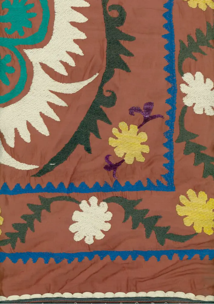 This satin suzani showcases cotton-embroidered rosettes, displaying exquisite craftsmanship. Measuring 54 inches by 86 inches (137 cm x 218 cm), it remains in excellent condition.