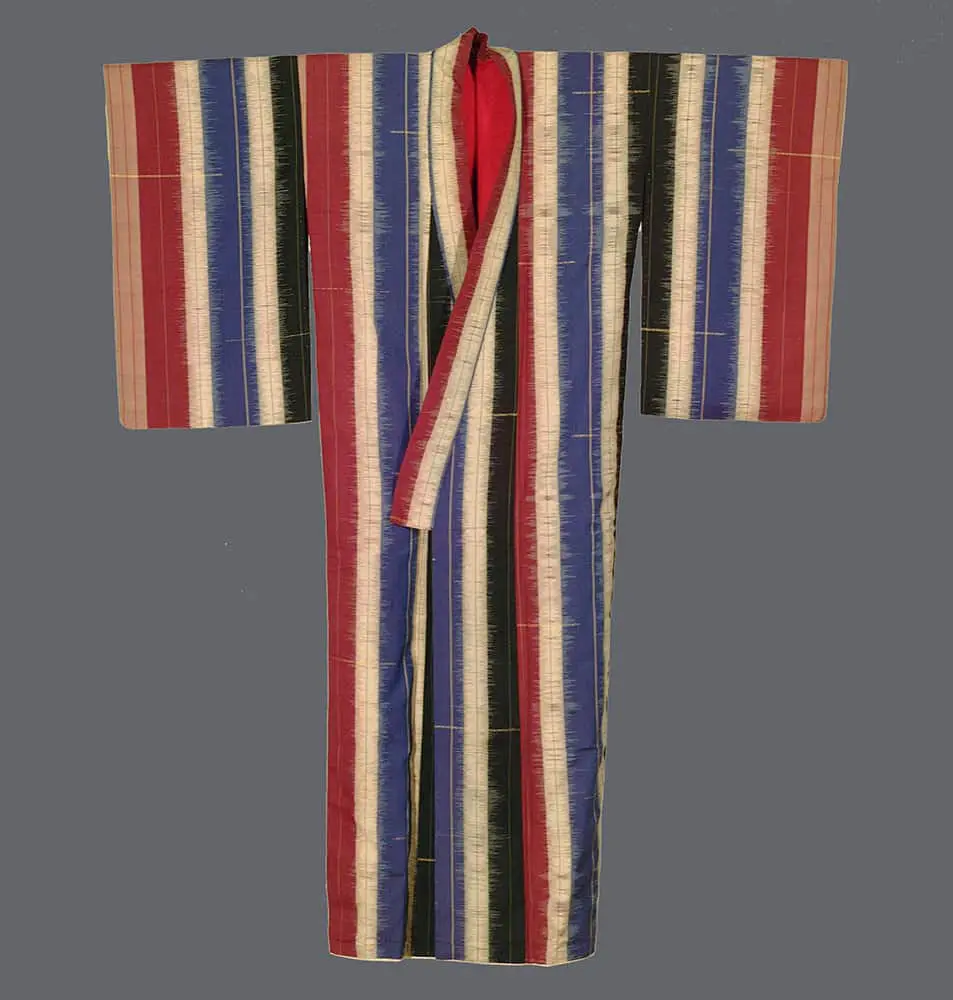 The vertical orientation of the design creates an elongating effect that enhances the kimono's inherent architectural qualities, while the irregular stripe widths prevent the pattern from becoming monotonous, instead generating a syncopated visual rhythm. The color combination—particularly the interplay between the deep indigo and warm earth tones—demonstrates a sophisticated understanding of color theory that aligns with contemporary Western design movements while maintaining distinctly Japanese aesthetic principles.