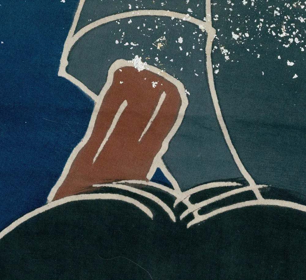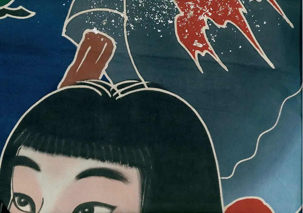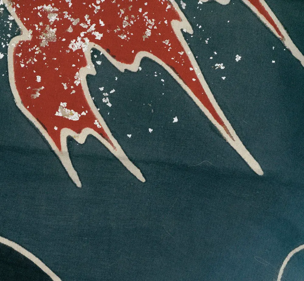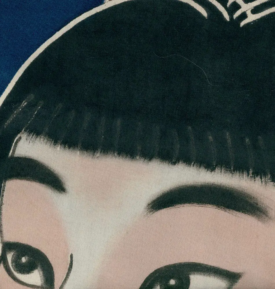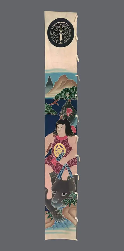This expansive painted cotton nobori banner depicts Kintaro and was crafted for a boy's celebration. It's in very good condition, measuring 211 inches (536 cm) in height and 27 inches (69 cm) in width.