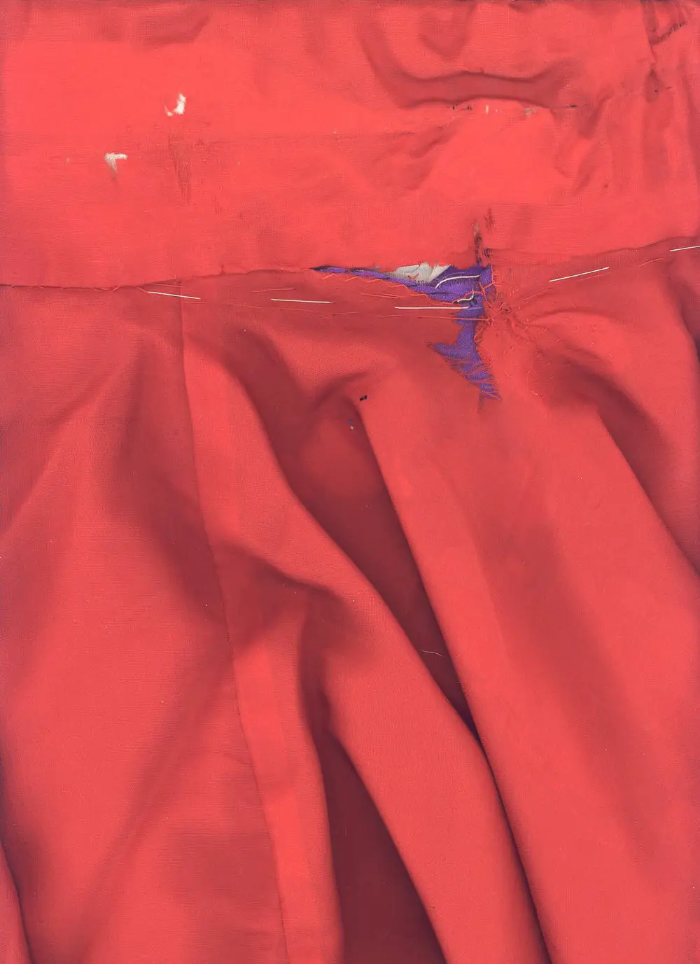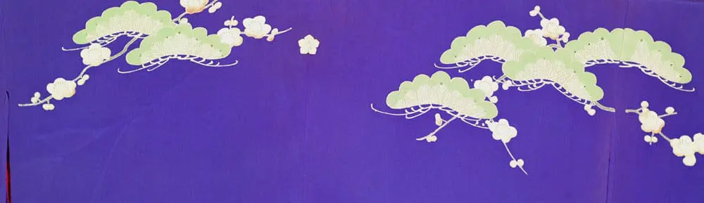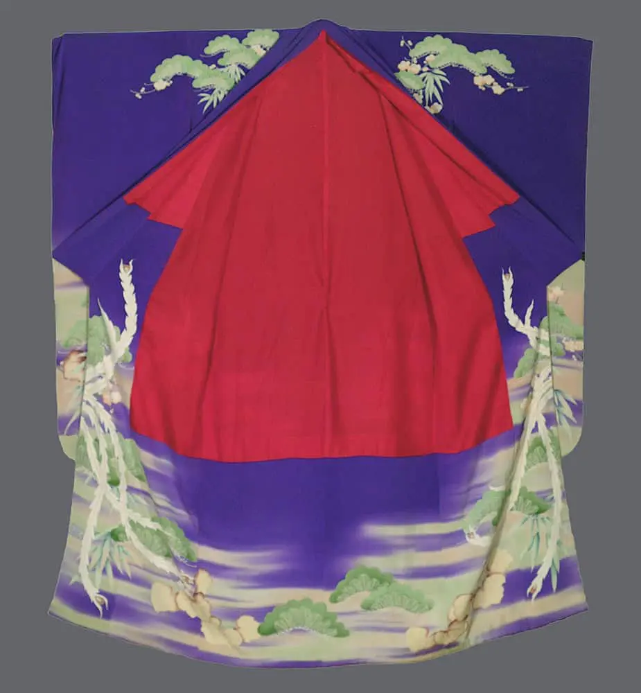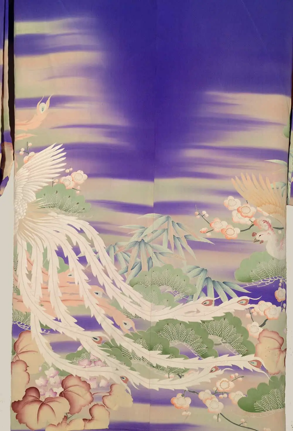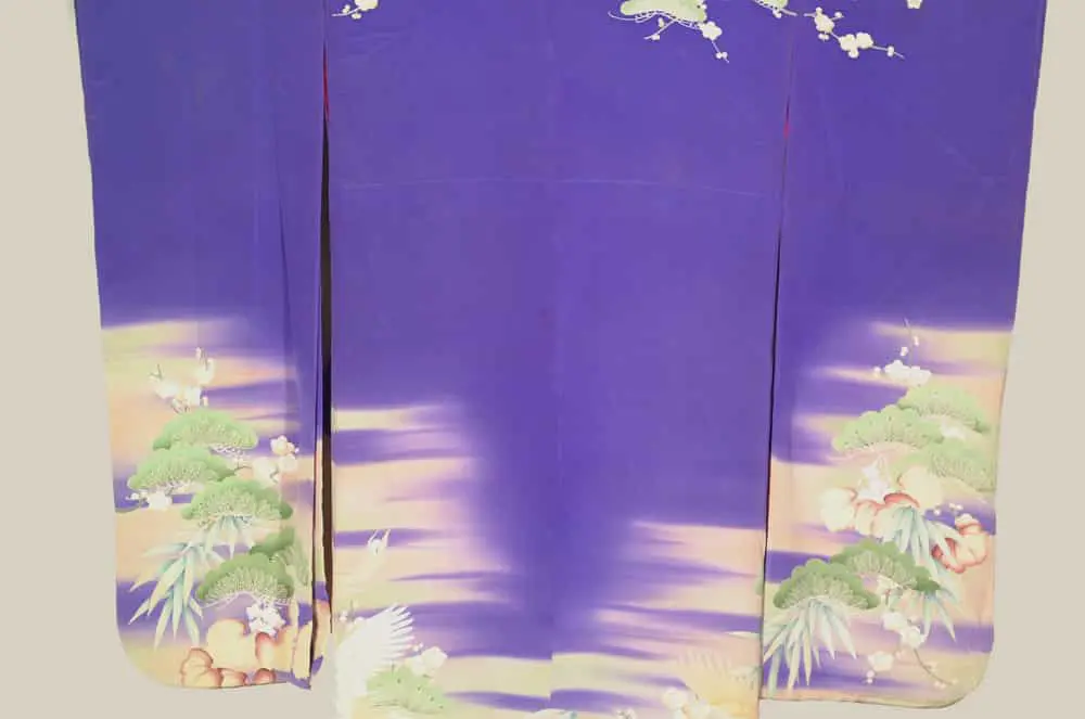 This captivating blue silk furisode showcases exquisite designs crafted using the yuzen technique, known for its paste-resist dyeing method. The motifs, including cranes and flowers, are highlighted using satin stitch and sagara embroidery, lending a remarkable depth to the patterns. The intricate design continues onto the lower inner lining, while the upper inner lining features vibrant red silk.