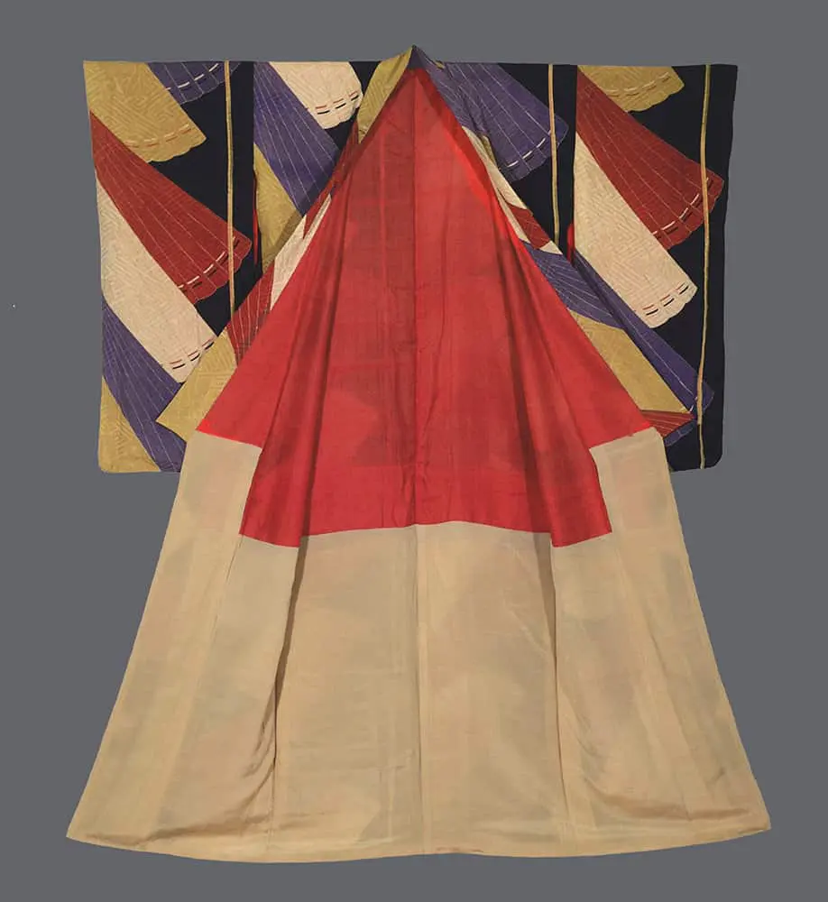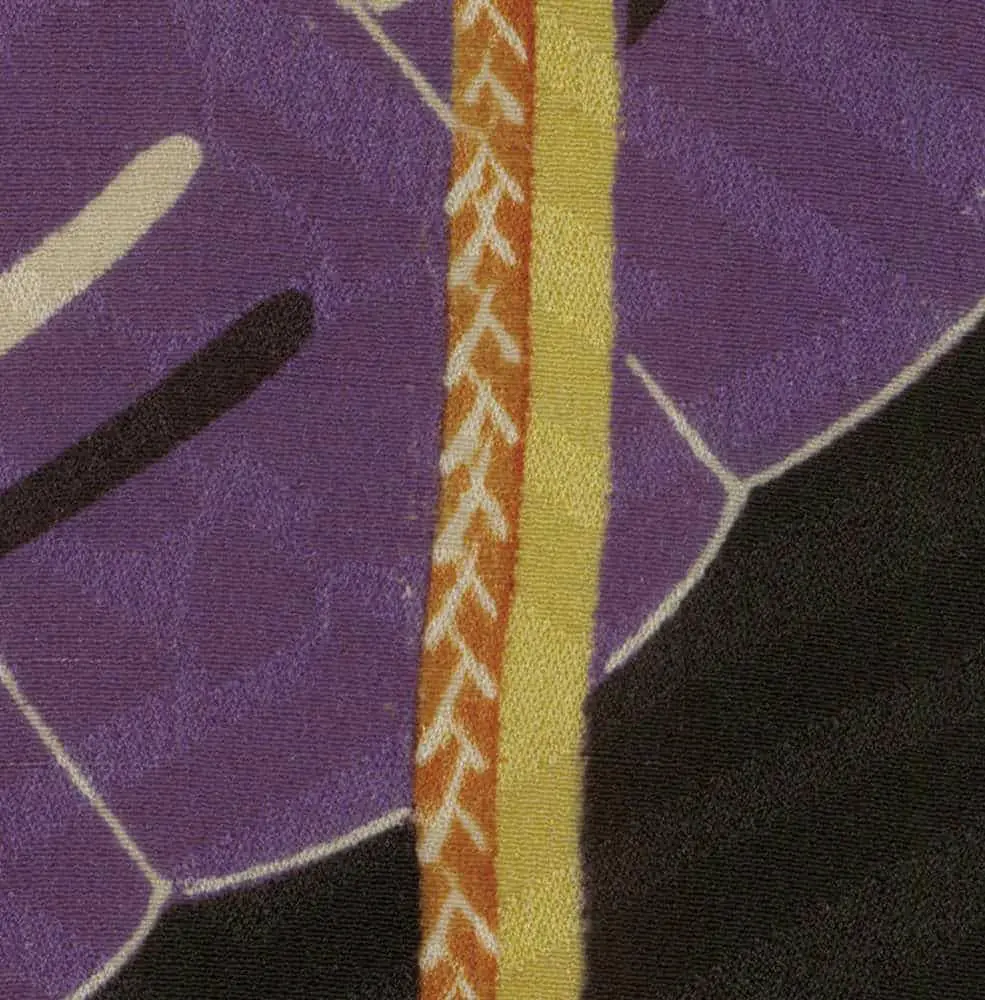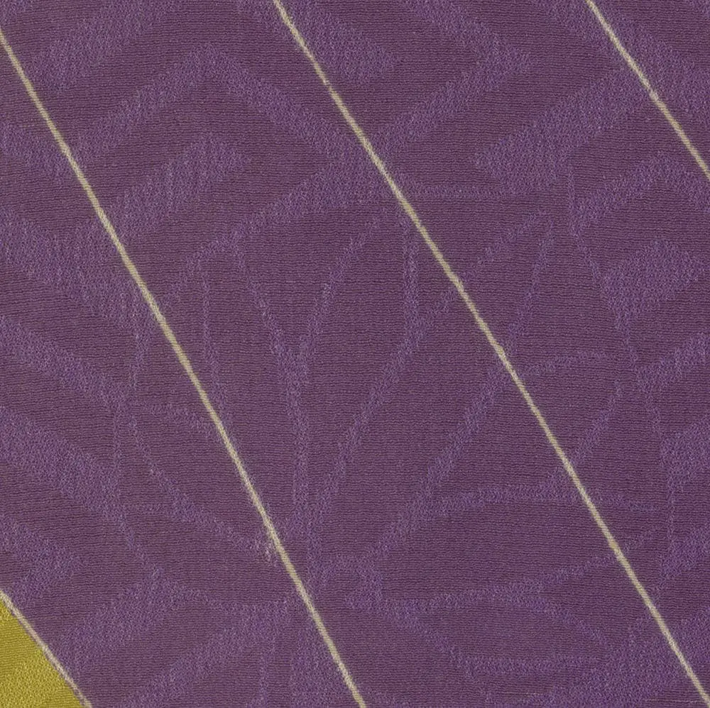 This striking kimono exemplifies the bold geometric modernism that emerged during Japan's Taisho period, when traditional craftsmanship intersected with contemporary design sensibilities. The composition features dramatically stylized fans rendered as angular, overlapping diagonal bands in rich purple, rust orange, olive green, cream, and deep black, creating a dynamic visual rhythm that suggests movement and vitality. These fan motifs, stenciled onto a luxurious rinzu silk background with its subtle sayagata (interlocking swastika) pattern, demonstrate the sophisticated interplay between surface decoration and underlying textile structure that characterizes high-quality Japanese silk work.