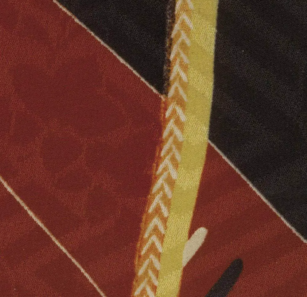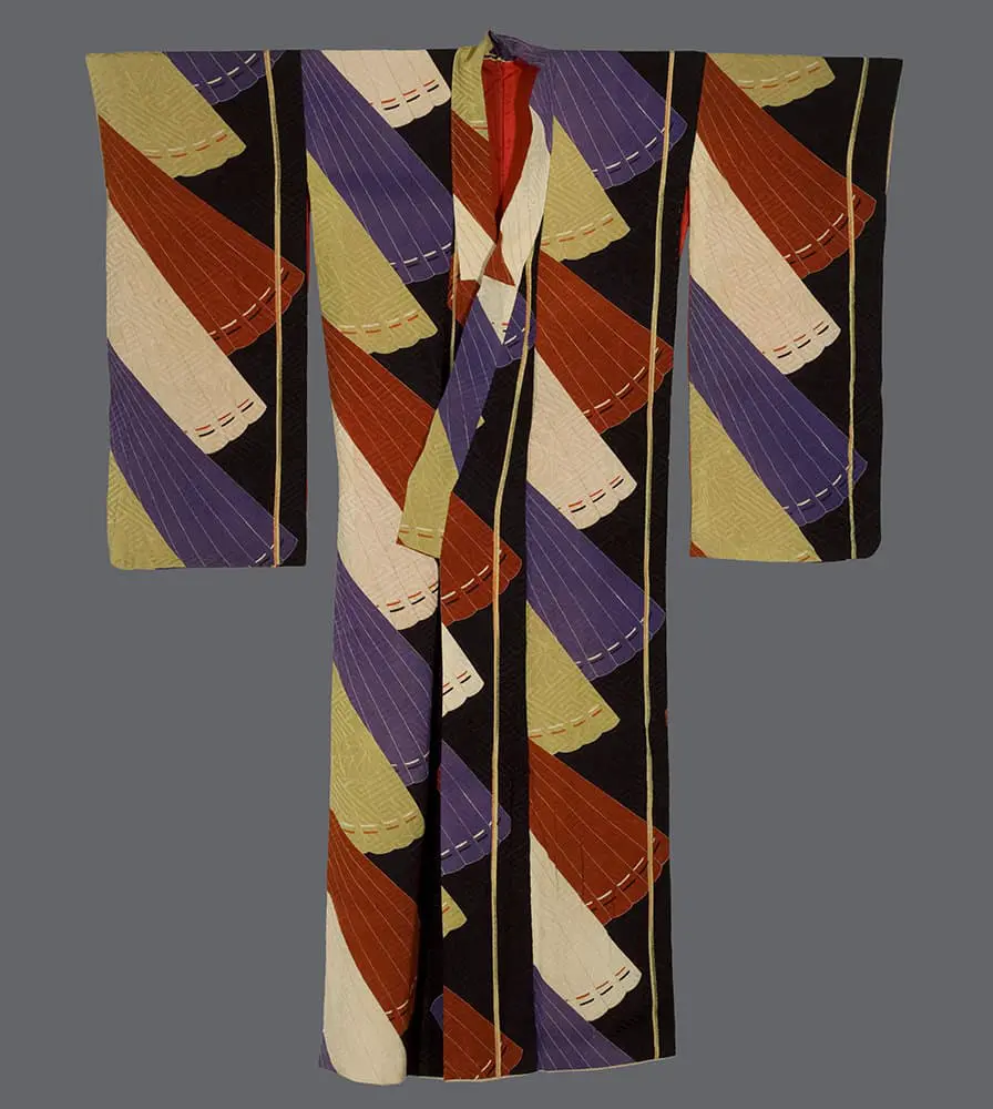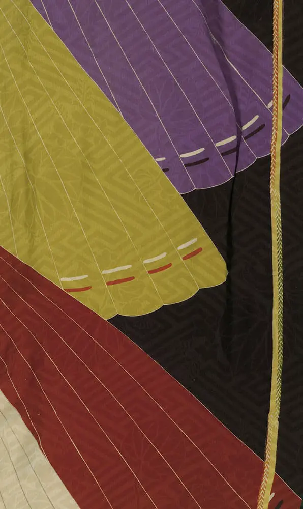 The aesthetic approach reflects influences from both Art Deco's geometric boldness and traditional Japanese design principles, particularly the concept of asymmetrical balance and the use of negative space. The fans themselves carry deep cultural significance as symbols of prosperity, good fortune, and the gradual unfolding of happiness, while their geometric interpretation speaks to the period's embrace of modernity. The parallel stitching lines that traverse each colored section create additional textural interest and emphasize the textile's construction, while the subtle gradations within each colored band reveal the artisan's mastery of stenciling techniques.