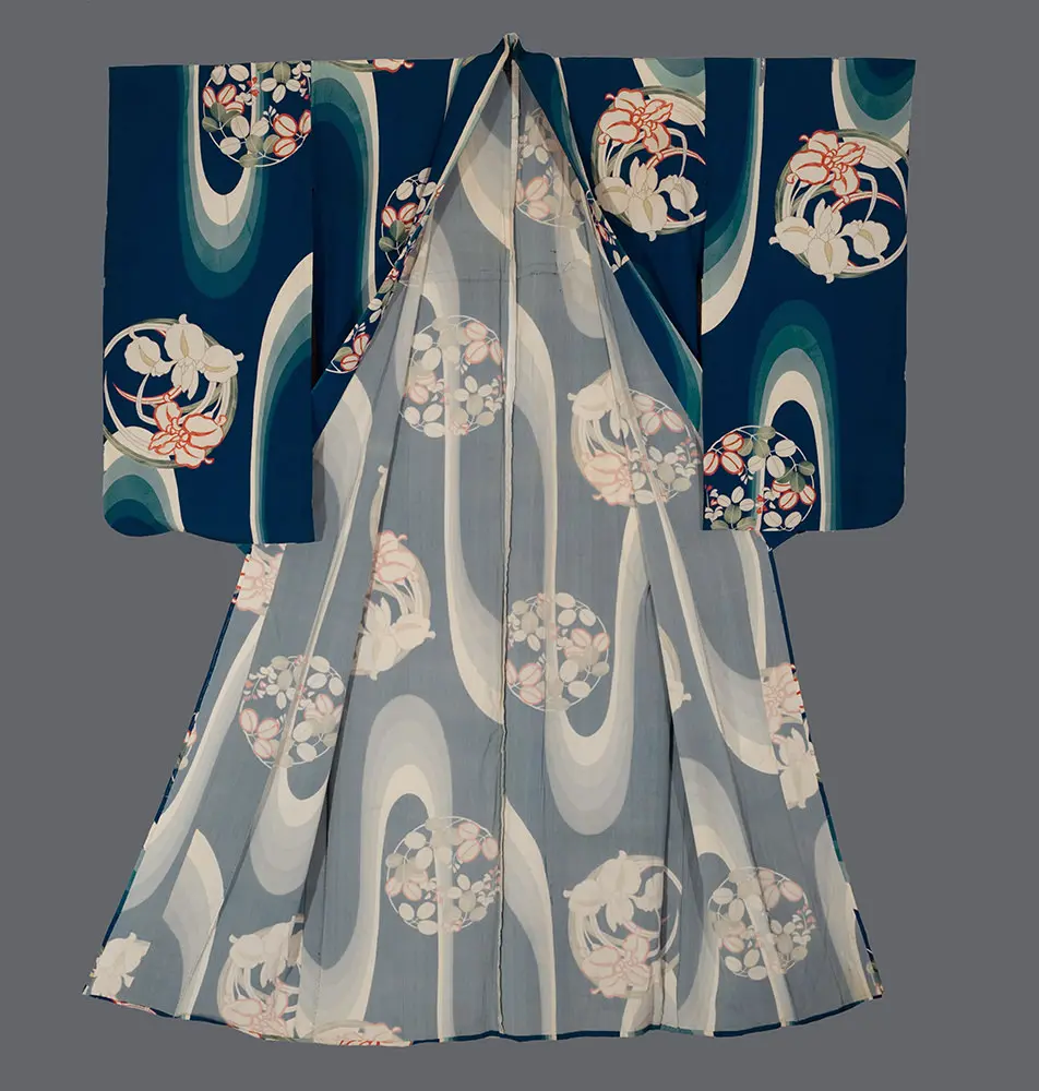 This striking chirimen silk summer kimono demonstrates the period's characteristic blend of classical motifs with modern production methods, featuring stylized flower roundels floating against flowing ribbons of pale blue and cream that create a sense of movement reminiscent of water or wind patterns.