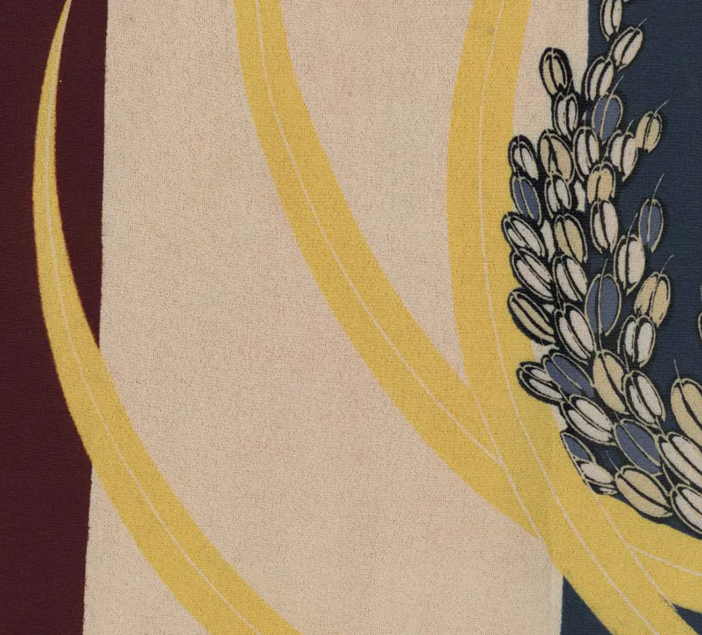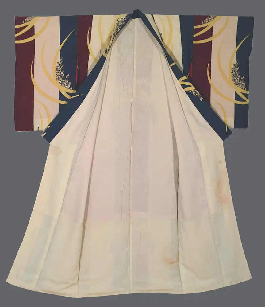 The artistic execution demonstrates remarkable technical sophistication in its use of silkscreen printing to achieve both precise geometric forms and subtle botanical details. The rice motifs carry profound cultural significance as symbols of prosperity, fertility, and the fundamental sustenance of Japanese civilization, while their placement within flowing curved bands suggests the natural cycles of growth and harvest. The bold color palette of navy, burgundy, and cream reflects the Taishō period's embrace of more dramatic chromatic contrasts. The overall design vocabulary suggests influences from contemporary international art movements, particularly the geometric abstraction and bold graphics emerging from European avant-garde circles, while the rice symbolism maintains the garment's distinctly Japanese cultural identity. This synthesis represents the period's characteristic confidence in adapting global aesthetic trends while preserving essential cultural meanings, creating a uniquely modern Japanese textile that speaks to both international sophistication and national pride.