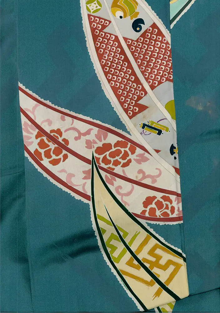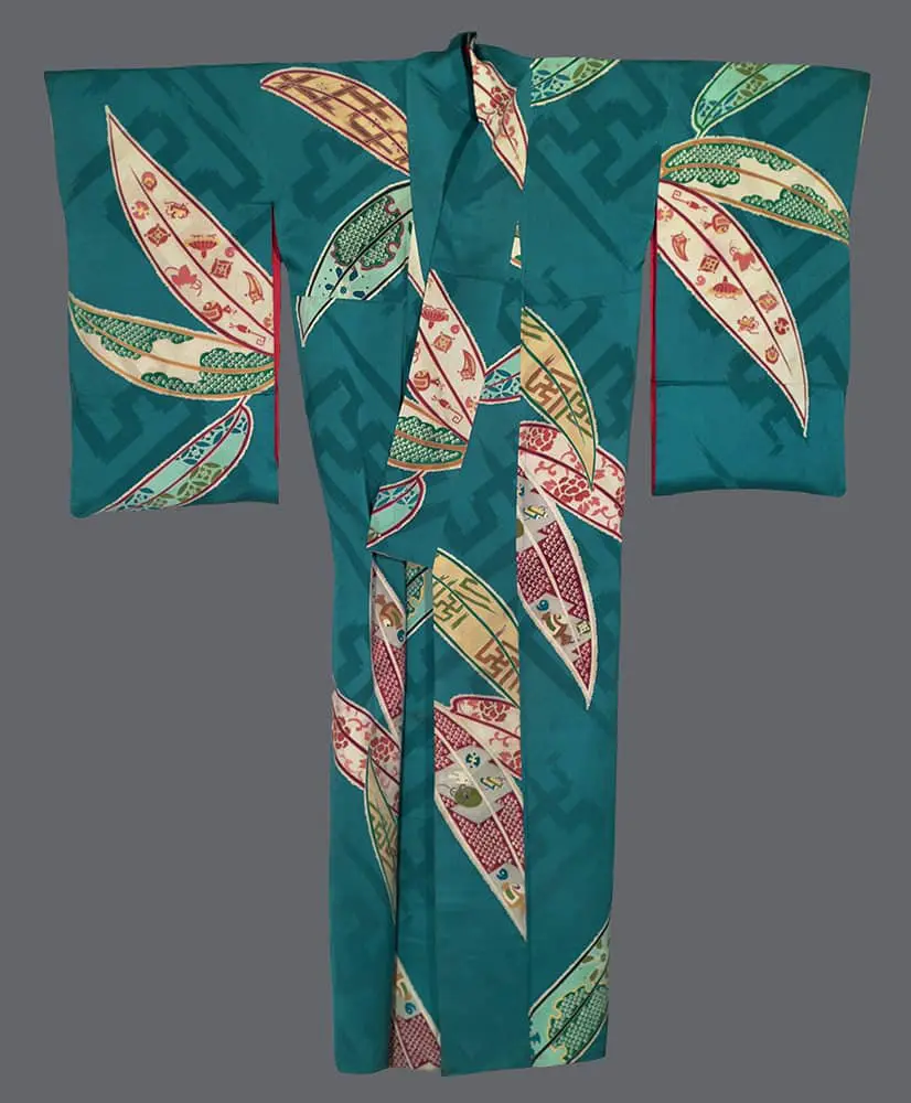 This silkscreened silk kimono represents a fascinating example of Taishō period textile innovation, where traditional Japanese motifs and techniques were reinterpreted through modern industrial processes. The striking teal ground provides a bold, contemporary backdrop for an array of stylized bamboo leaves that appear to dance across the garment's surface in dynamic, asymmetrical arrangements. Each leaf showcases sophisticated pattern-within-pattern design, featuring faux shibori resist patterns, geometric designs, and simulated rinzu damask textures achieved through the precision of silkscreen printing rather than traditional weaving or dyeing methods.