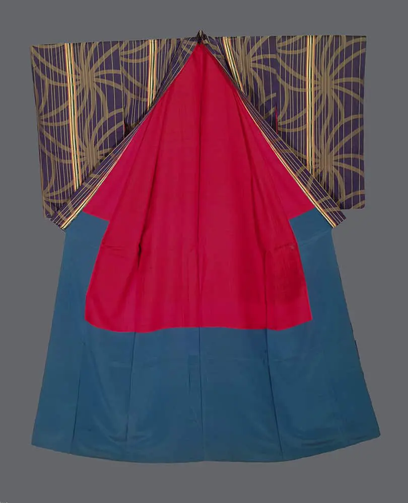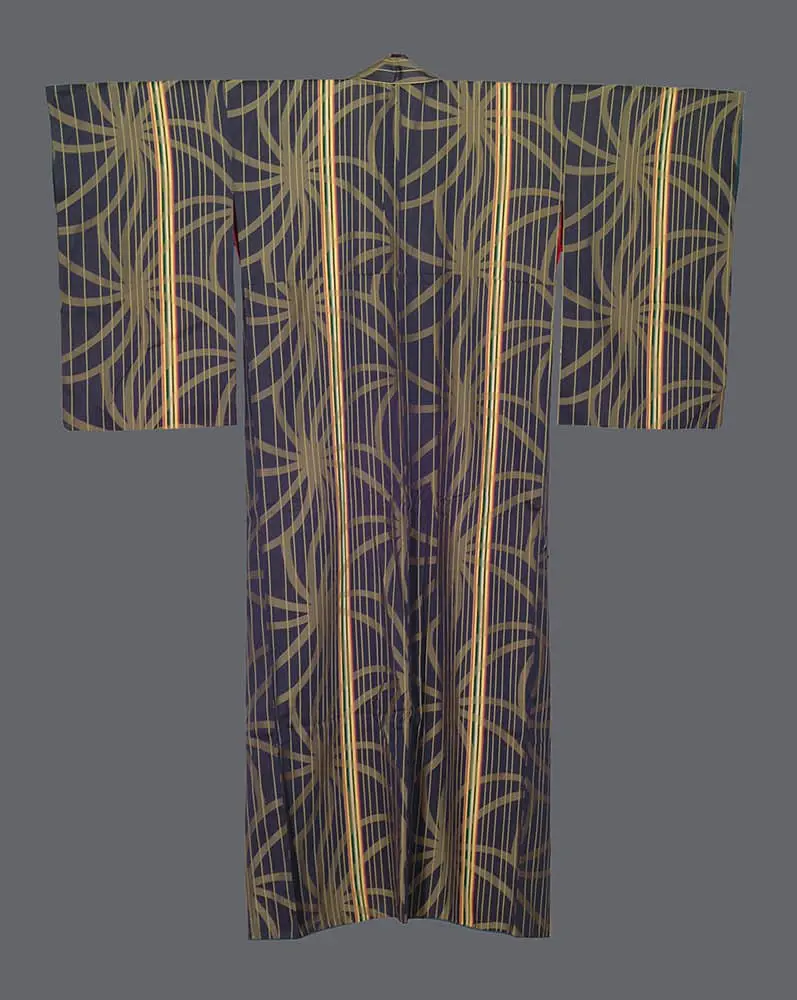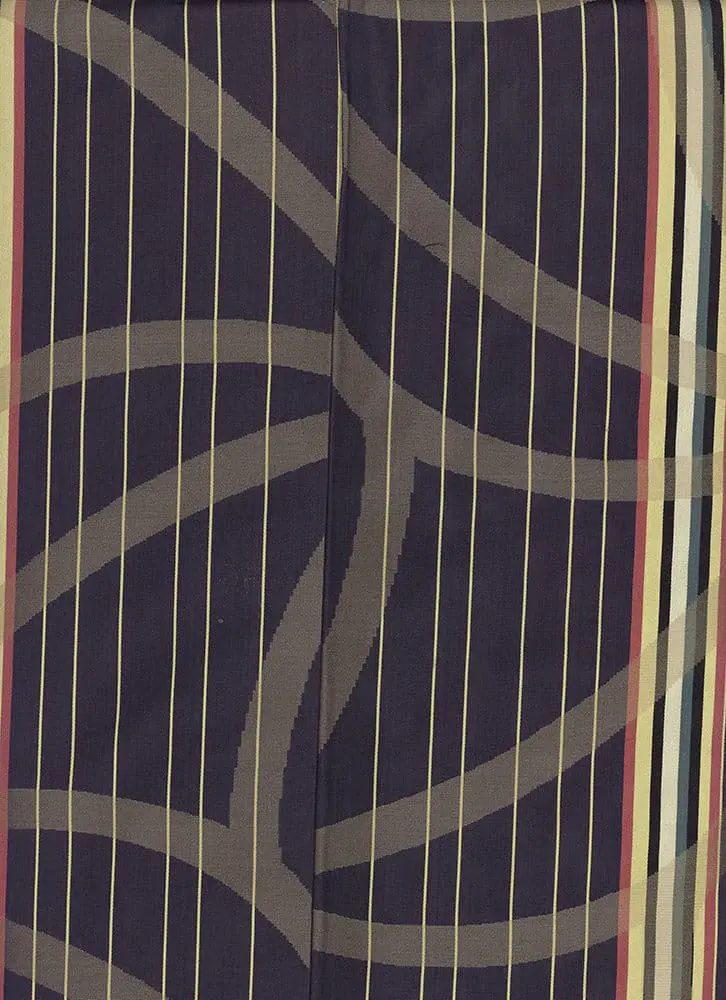 This silk kimono displays a sophisticated geometric pattern that strongly evokes the Art Deco movement that flourished during the 1920s and 1930s. The design features an intricate network of interlocking curved lines that create stylized leaf or feather-like motifs against a deep purple background, accented with golden yellow vertical stripes. This pattern demonstrates the Art Deco fascination with geometric abstraction of natural forms, transforming organic elements into rhythmic, angular compositions that suggest both movement and luxury.