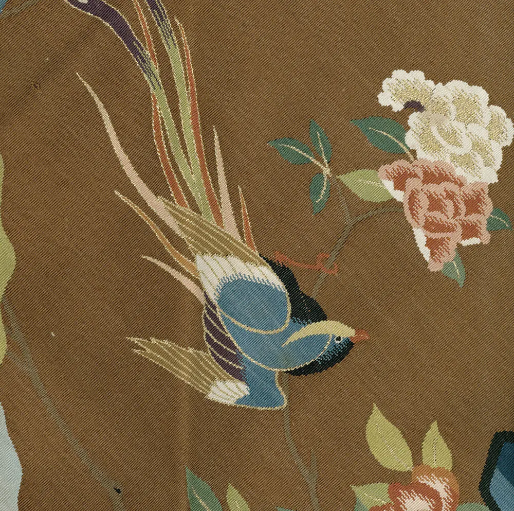 This silk Buddhist temple cloth presents a depiction of a phoenix alongside camellias, crafted using the laborious "tsume tsuzure" tapestry technique. It remains in very good condition, though it shows slight staining and several tiny holes. Its dimensions are 27 inches in width by 20 inches in height (69 cm x 51 cm).