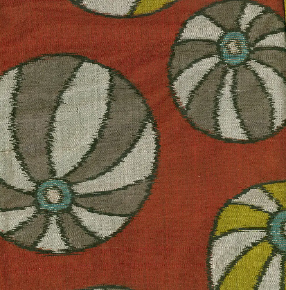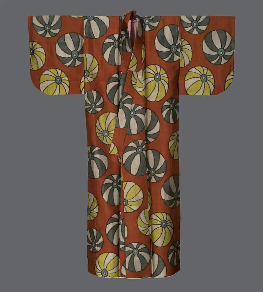 This vibrant meisen kimono exemplifies the democratization of Japanese textile artistry during the interwar period, showcasing the bold geometric exuberance that characterized modern Japanese design through its dynamic array of temari ball motifs scattered across a warm rust-orange ground. The temari patterns, rendered in varying combinations of cream, yellow, sage green, and charcoal gray, display the characteristic radial symmetry of these traditional hand-balls, each one featuring precise geometric divisions that create mesmerizing optical effects. The meisen technique, which employed innovative resist-dyeing methods on silk threads before weaving, allowed for the crisp definition and vibrant color saturation that gives this textile its striking visual impact and affordability for middle-class consumers.
