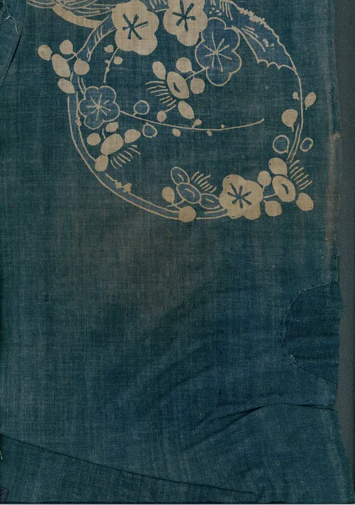 This hand-spun, hand-woven plain-weave cotton tsutsugaki panel features circular crests created using rice-paste resist, then dyed in indigo against the natural white textile. The crests, selected for their symbolic significance, may not necessarily relate to the family crests of the bride and groom. Comprised of four 12-inch wide strips stitched together, this panel shows some signs of wear, including fading, staining, and several patched holes, yet it remains in good condition.